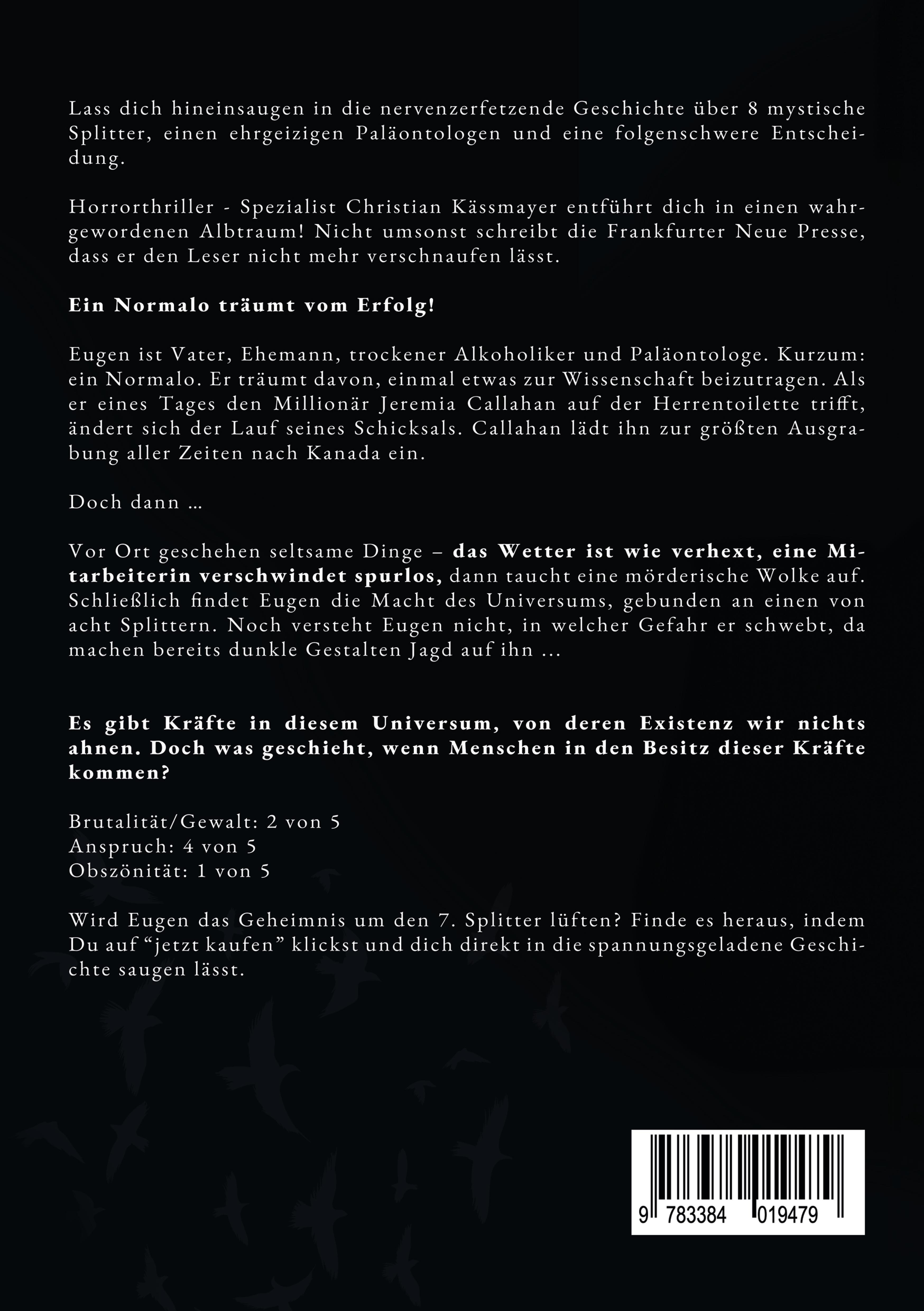 Lass dich hineinsaugen in die nervenzerfetzende Geschichte über 8 mystische Splitter, einen ehrgeizigen Paläontologen und eine folgenschwere Entscheidung.Horrorthriller - Spezialist Christian Kässmayer entführt dich in einen wahrgewordenen Albtraum! Nicht umsonst schreibt die Frankfurter Neue Presse, dass er den Leser nicht mehr verschnaufen lässt.Ein Normalo träumt vom Erfolg!Eugen ist Vater, Ehemann, trockener Alkoholiker und Paläontologe. Kurzum: ein Normalo. Er träumt davon, einmal etwas zur Wissenschaft beizutragen. Als er eines Tages den Millionär Jeremia Callahan auf der Herrentoilette trifft, ändert sich der Lauf seines Schicksals. Callahan lädt ihn zur größten Ausgrabung aller Zeiten nach Kanada ein.Doch dann ...Vor Ort geschehen seltsame Dinge - das Wetter ist wie verhext, eine Mitarbeiterin verschwindet spurlos, dann taucht eine mörderische Wolke auf. Schließlich findet Eugen die Macht des Universums, gebunden an einen von acht Splittern. Noch versteht Eugen nicht, in welcher Gefahr er schwebt, da machen bereits dunkle Gestalten Jagd auf ihn ...Es gibt Kräfte in diesem Universum, von deren Existenz wir nichts ahnen. Doch was geschieht, wenn Menschen in den Besitz dieser Kräfte kommen?Brutalität/Gewalt: 2 von 5Anspruch: 4 von 5Obszönität: 1 von 5Wird Eugen das Geheimnis um den 7. Splitter lüften? Finde es heraus, indem Du auf "jetzt kaufen", klickst und dich direkt in die spannungsgeladene Geschichte saugen lässt.