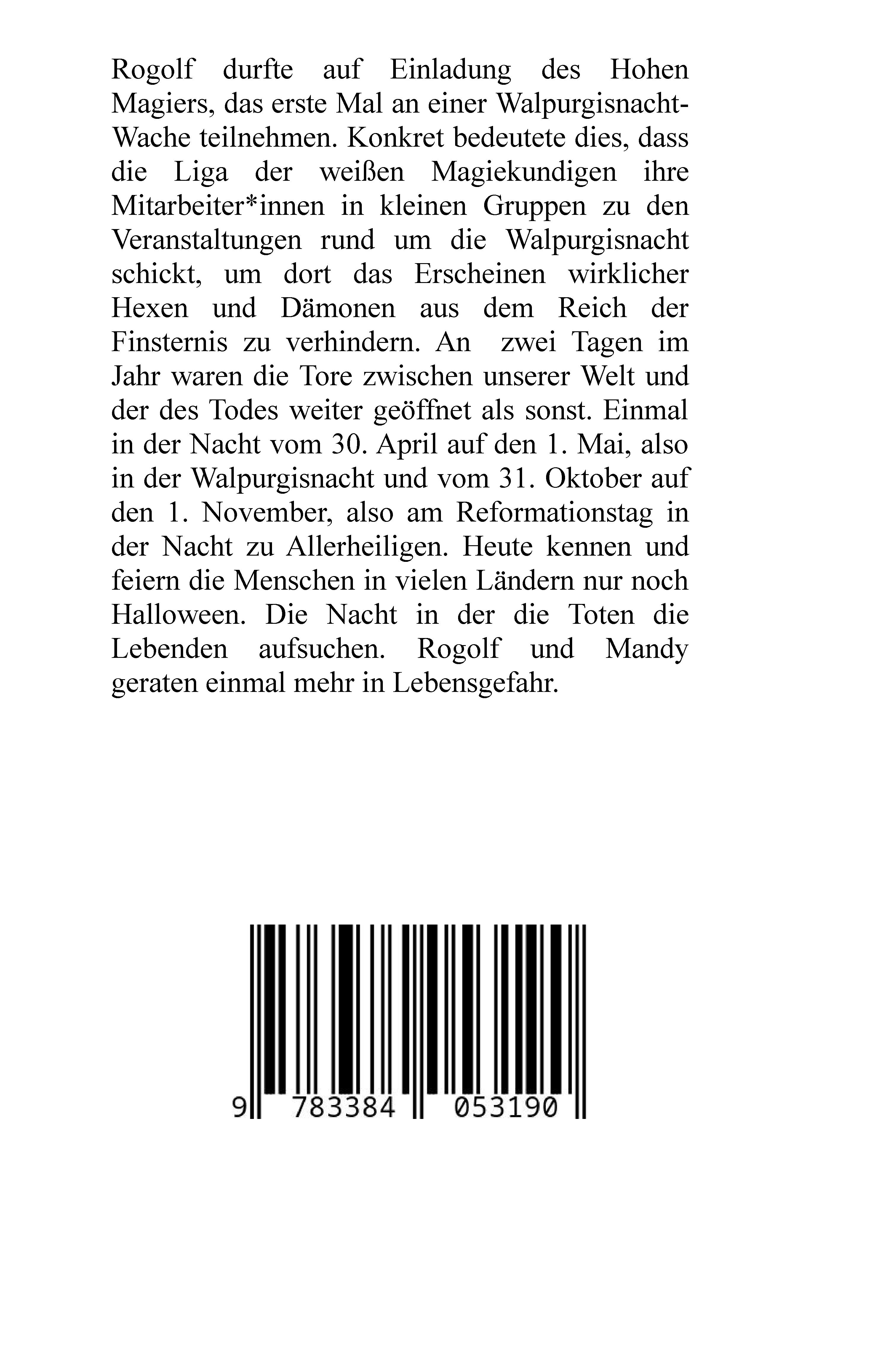 Im dritten Band über Rogolf den Barden, Mandy und die Liga der weißen Magiekundigen dreht sich alles um die Walpurgisnacht und die Feiern rund um Hexen und den Teufel, die hauptsächlich in vielen Orten im Harz stattfinden. Da in dieser Nacht - genau wie in der Nacht vom 31.10. auf den 01.11., also vom Reformationstag / Halloween auf Allerheiligen - die Tore zur Welt der Toten weiter geöffnet sind als es normalerweise der Fall ist, versuchen die wirklichen Hexen und Dämonen in unsere Welt zu kommen. Dann schlägt die Stunde der Liga-Mitarbeiter*innen, deren Aufgabe darin besteht, die echten Wesen der Finsternis aufzuspüren und zu vernichten.