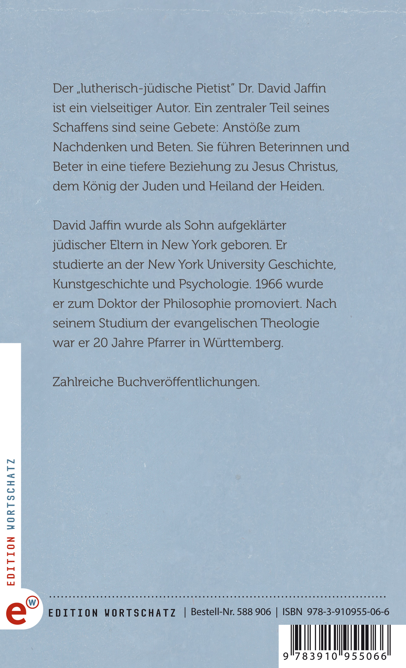 Der „lutherisch-jüdische Pietist” Dr. David Jaffin ist ein vielseitiger Autor. Ein zentraler Teil seines Schaffens sind seine Gebete: Anstöße zum Nachdenken und Beten. Sie führen Beterinnen und Beter in eine tiefere Beziehung zu Jesus Christus, dem König der Juden und Heiland der Heiden.