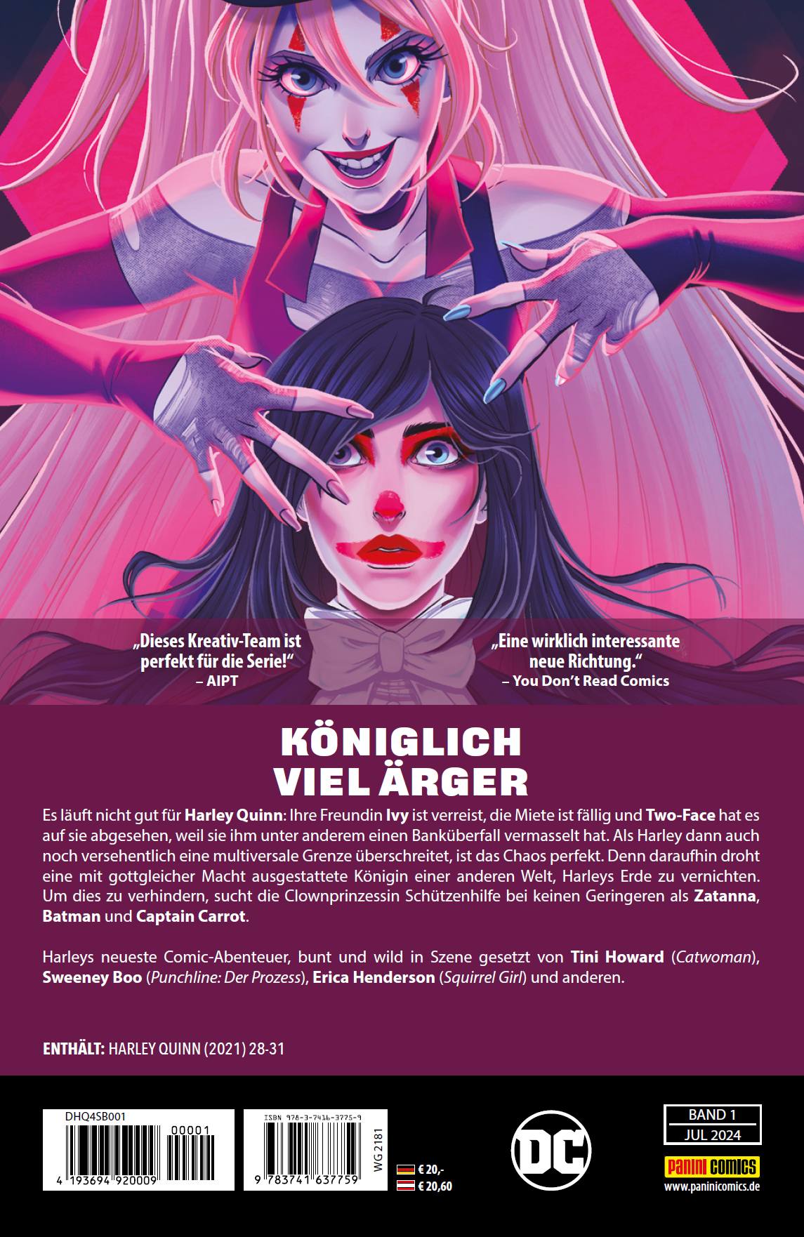 KÖNIGLICH VIEL ÄRGEREs läuft nicht gut für Harley Quinn: Ihre Freundin Ivy ist verreist, die Miete ist fällig und Two-Face hat es auf sie abgesehen, weil sie ihm unter anderem einen Banküberfall vermasselt hat. Als Harley dann auch noch versehentlich eine multiversale Grenze überschreitet, ist das Chaos perfekt. Denn daraufhin droht eine mit gottgleicher Macht ausgestattete Königin einer anderen Welt, Harleys Erde zu vernichten. Um dies zu verhindern, sucht die Clownprinzessin Schützenhilfe bei keinen Geringeren als Zatanna, Batman und Captain Carrot. Harleys neueste Comic-Abenteuer, bunt und wild in Szene gesetzt von Tini Howard (Catwoman), Sweeney Boo (Punchline: Der Prozess), Erica Henderson (Squirrel Girl) und anderen.ENTHÄLT: HARLEY QUINN (2021) 28-31