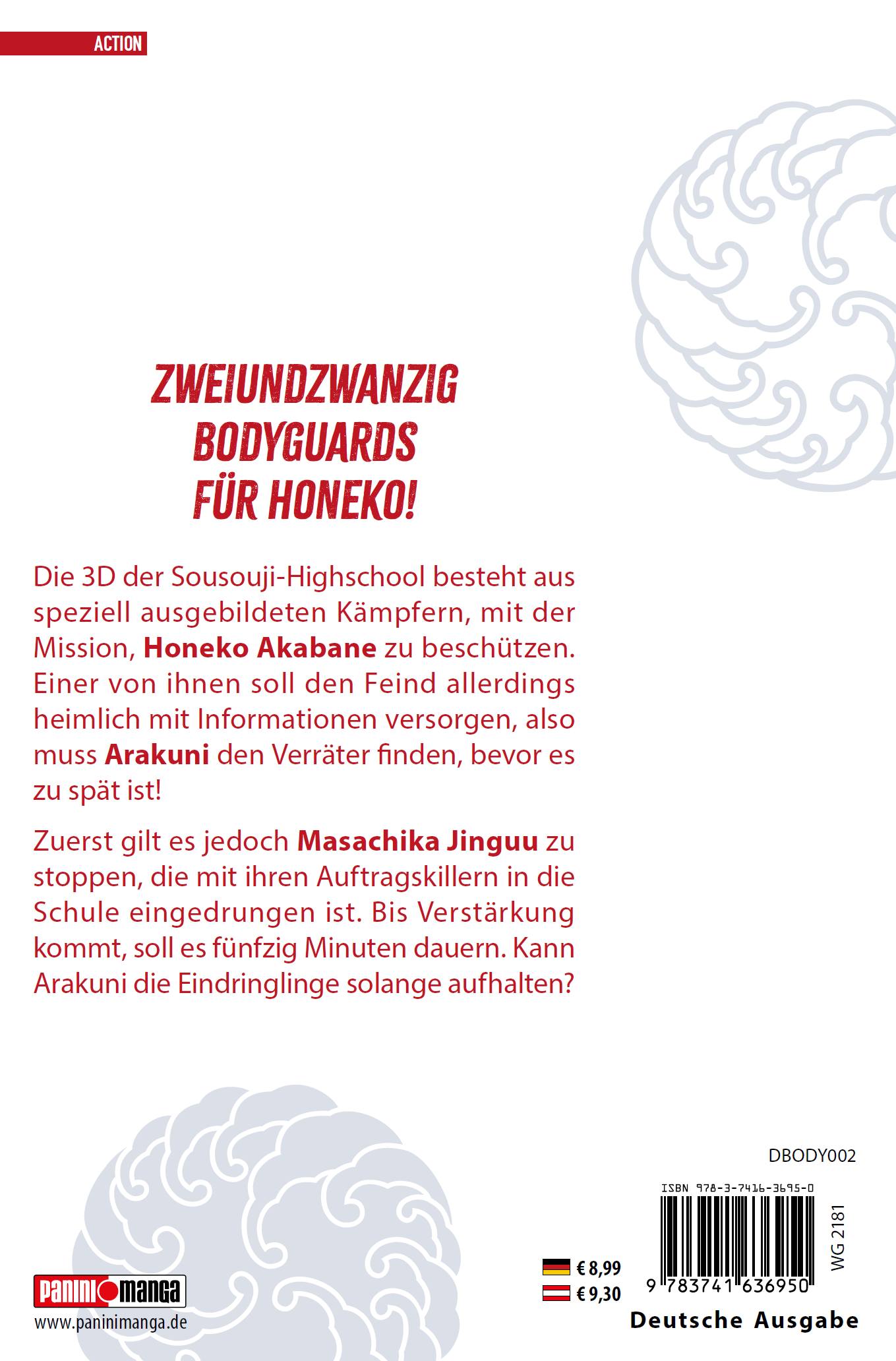 Honeko Akabanes Bodyguard vereint spannende Abenteuer, witzige Situationen und herzerwärmende Momente zu einem grandiosen Gesamtpaket!Arakuni aus der 3D der Sousouji-Highschool traut seinen Ohren nicht, als er erfährt, dass seine Klassenkameradin Honeko das Ziel von mehreren Auftragskillern ist. Und jetzt wird ausgerechnet er von einem Gangsterboss gebeten, Honeko zu beschützen und sicherzustellen, dass sie ihr letztes Schuljahr unbeschadet übersteht. Allerdings darf Honeko von all dem nichts erfahren!Das erwartet dich in Band 2:ZWEIUNDZWANZIG BODYGUARDS FÜR HONEKO!Die 3D der Sousouji-Highschool besteht aus speziell ausgebildeten Kämpfern, mit der Mission, Honeko Akabane zu beschützen. Einer von ihnen soll den Feind allerdings heimlich mit Informationen versorgen, also muss Arakuni den Verräter finden, bevor es zu spät ist.Zuerst gilt es jedoch Masachika Jinguu zu stoppen, die mit ihren Auftragskillern in die Schule eingedrungen ist. Bis Verstärkung kommt, soll es fünfzig Minuten dauern. Kann Arakuni die Eindringlinge solange aufhalten?Für Fans von Action-, Abenteur-, Romance- und Comedymanga wie Assassination Classroom und Kaguya-sama: Love is war!
