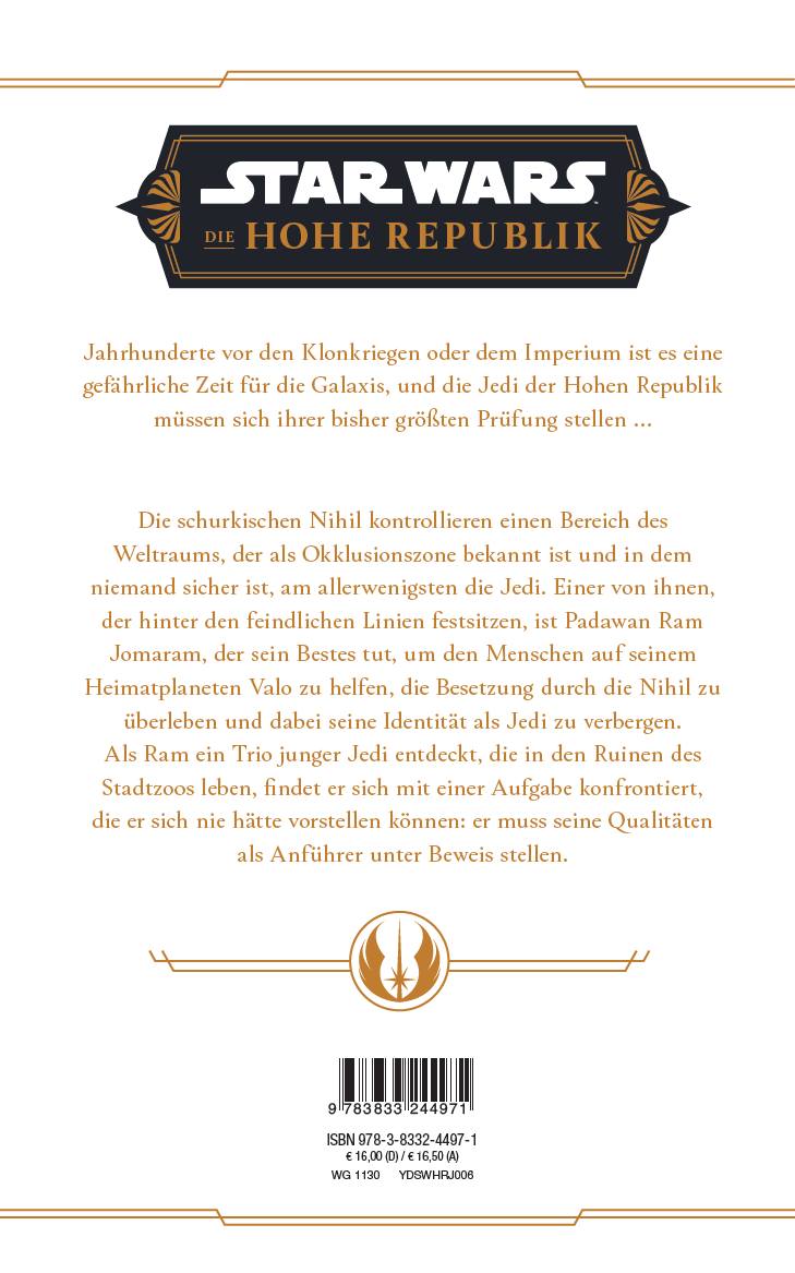 Jahrhunderte vor den Klonkriegen oder dem Imperium ist es eine gefährliche Zeit für die Galaxis, und die Jedi der Hohen Republik müssen sich ihrer bisher größten Prüfung stellen ... Die schurkischen Nihil kontrollieren einen Bereich des Weltraums, der als Okklusionszone bekannt ist und in dem niemand sicher ist, am allerwenigsten die Jedi. Einer von ihnen, der hinter den feindlichen Linien festsitzen, ist Padawan Ram Jomaram, der sein Bestes tut, um den Menschen auf seinem Heimatplaneten Valo zu helfen, die Besetzung durch die Nihil zu überleben und dabei seine Identität als Jedi zu verbergen. Als Ram ein Trio junger Jedi entdeckt, die in den Ruinen des Stadtzoos leben, findet er sich mit einer Aufgabe konfrontiert, die er sich nie hätte vorstellen können: er muss seine Qualitäten als Anführer unter Beweis stellen.