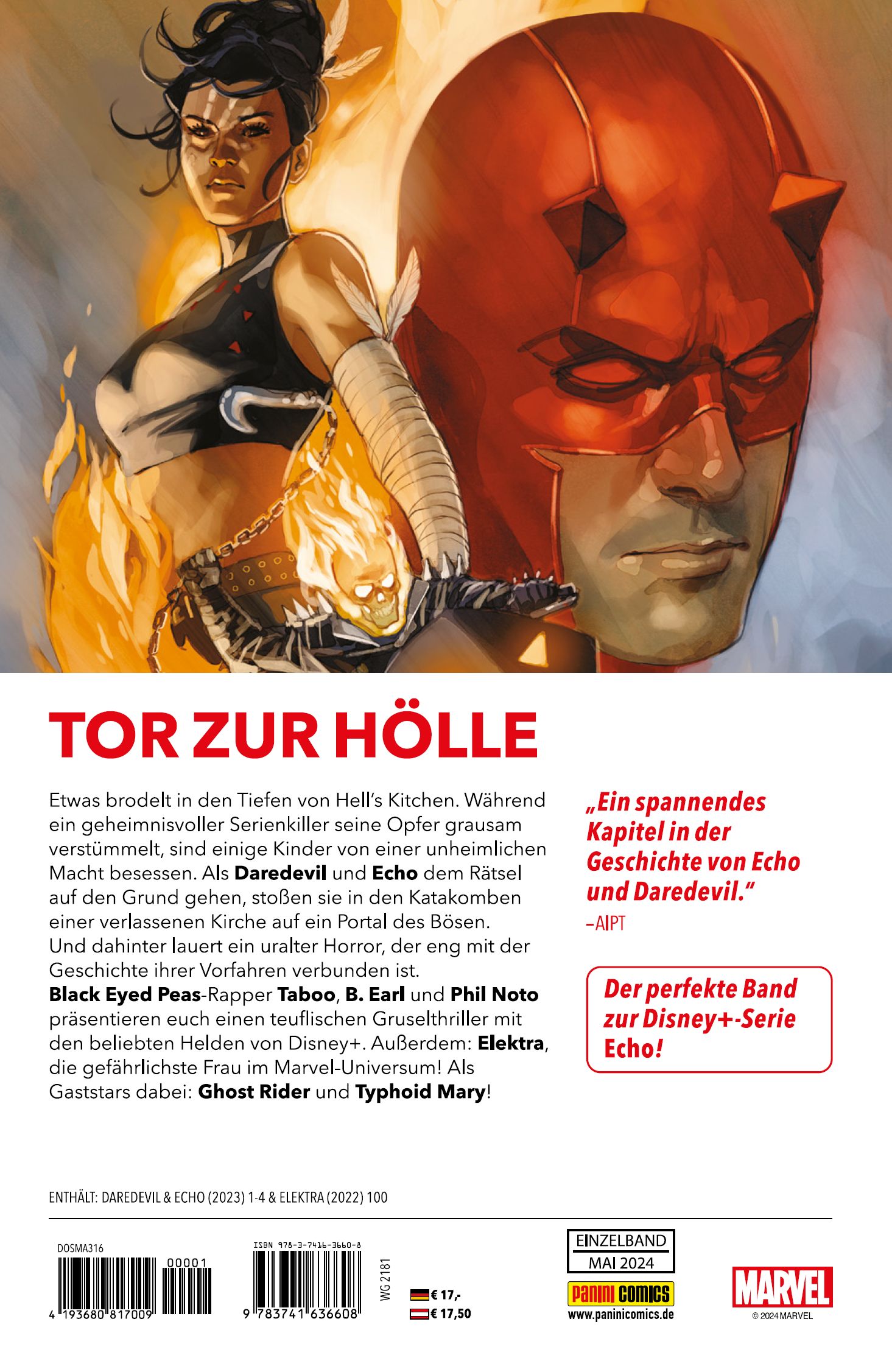 TOR ZUR HÖLLEEtwas brodelt in den Tiefen von Hell's Kitchen. Während ein geheimnisvoller Serienkiller seine Opfer grausam verstümmelt, sind einige Kinder von einer unheimlichen Macht besessen. Als Daredevil und Echo dem Rätsel auf den Grund gehen, stoßen sie in den Katakomben einer verlassenen Kirche auf ein Portal des Bösen. Und dahinter lauert ein uralter Horror, der eng mit der Geschichte ihrer Vorfahren verbunden ist. Black Eyed Peas-Rapper Taboo, B. Earl und Phil Noto präsentieren euch einen teuflischen Gruselthriller mit den beliebten Helden von Disney+. Außerdem: Elektra, die gefährlichste Frau im Marvel-Universum! Als Gaststars dabei: Ghost Rider und Typhoid Mary!ENTHÄLT: DAREDEVIL & ECHO (2023) 1-4 & ELEKTRA (2022) 100Der perfekte Band zur Disney+-Serie Echo!