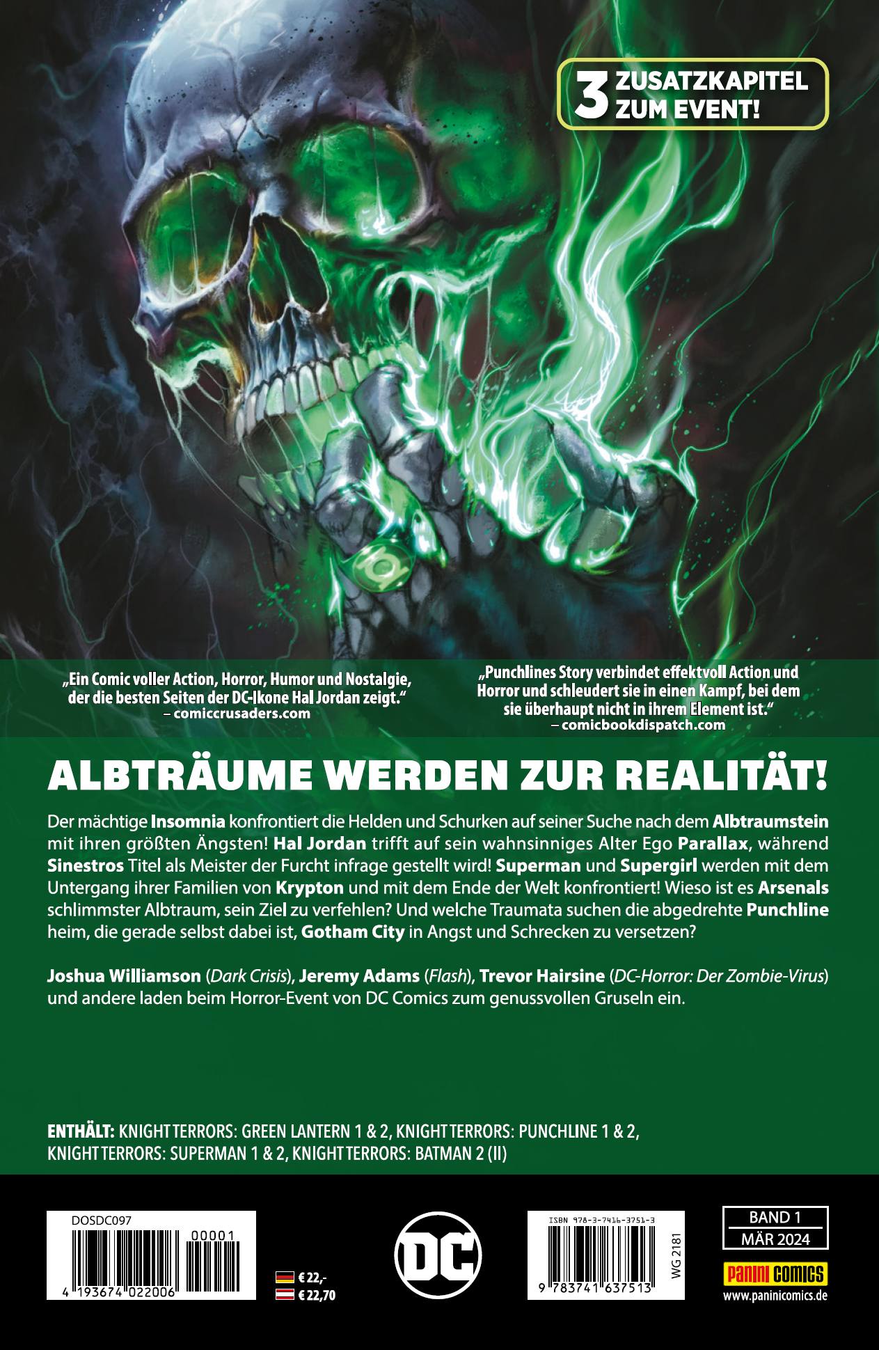 ALBTRÄUME WERDEN ZUR REALITÄT!Der mächtige Insomnia konfrontiert die Helden und Schurken auf seiner Suche nach dem Albtraumstein mit ihren größten Ängsten! Hal Jordan trifft auf sein wahnsinniges Alter Ego Parallax, während Sinestros Titel als Meister der Furcht infrage gestellt wird! Superman und Supergirl werden mit dem Untergang ihrer Familien von Krypton und mit dem Ende der Welt konfrontiert! Wieso ist Arsenals schlimmster Albtraum, sein Ziel zu verfehlen? Und welche Traumata suchen die abgedrehte Punchline heim, die gerade selbst dabei ist, Gotham City in Angst und Schrecken zu versetzen?Joshua Williamson (Dark Crisis), Jeremy Adams (Flash), Trevor Hairsine (DC-Horror: Der Zombie-Virus) und andere laden beim Horror-Event von DC Comics zum genussvollen Gruseln ein. ENTHÄLT: KNIGHT TERRORS: GREEN LANTERN 1 & 2, KNIGHT TERRORS: PUNCHLINE 1 & 2, KNIGHT TERRORS: SUPERMAN 1 &2, KNIGHT TERRORS: BATMAN 2 (II)3 Zusatzkapitel zum Event!