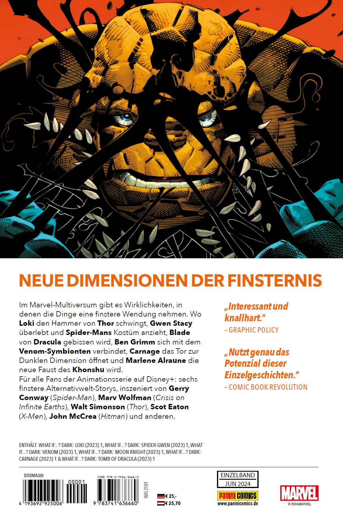 NEUE DIMENSIONEN DER FINSTERNISIm Marvel-Multiversum gibt es Wirklichkeiten, in denen die Dinge eine finstere Wendung nehmen. Wo Loki den Hammer von Thor schwingt; Gwen Stacy überlebt und Spider-Mans Kostüm anzieht; Blade von Dracula gebissen wird; Ben Grimm sich mit dem Venom-Symbionten verbindet; Carnage das Tor zur Dunklen Dimension öffnet, oder Marlene Alraune die neue Faust des Khonshu wird. Für alle Fans der Animationsserie auf Disney+: sechs finstere Alternativwelt-Storys, inszeniert von Gerry Conway (Spider-Man), Marv Wolfman (Crisis on Infinite Earths), Walt Simonson (Thor), Scot Eaton (X-Men), John McCrea (Hitman) und anderen.WHAT IF...? DARK: LOKI(2023) 1, WHAT IF...? DARK: SPIDER-GWEN (2023) 1, WHAT IF...? DARK: VENOM (2023) 1, WHAT IF...? DARK: MOON KNIGHT (2023) 1, WHAT IF...? DARK: CARNAGE (2023) 1 & WHAT IF...? DARK: TOMB OF DRACULA (2023) 1