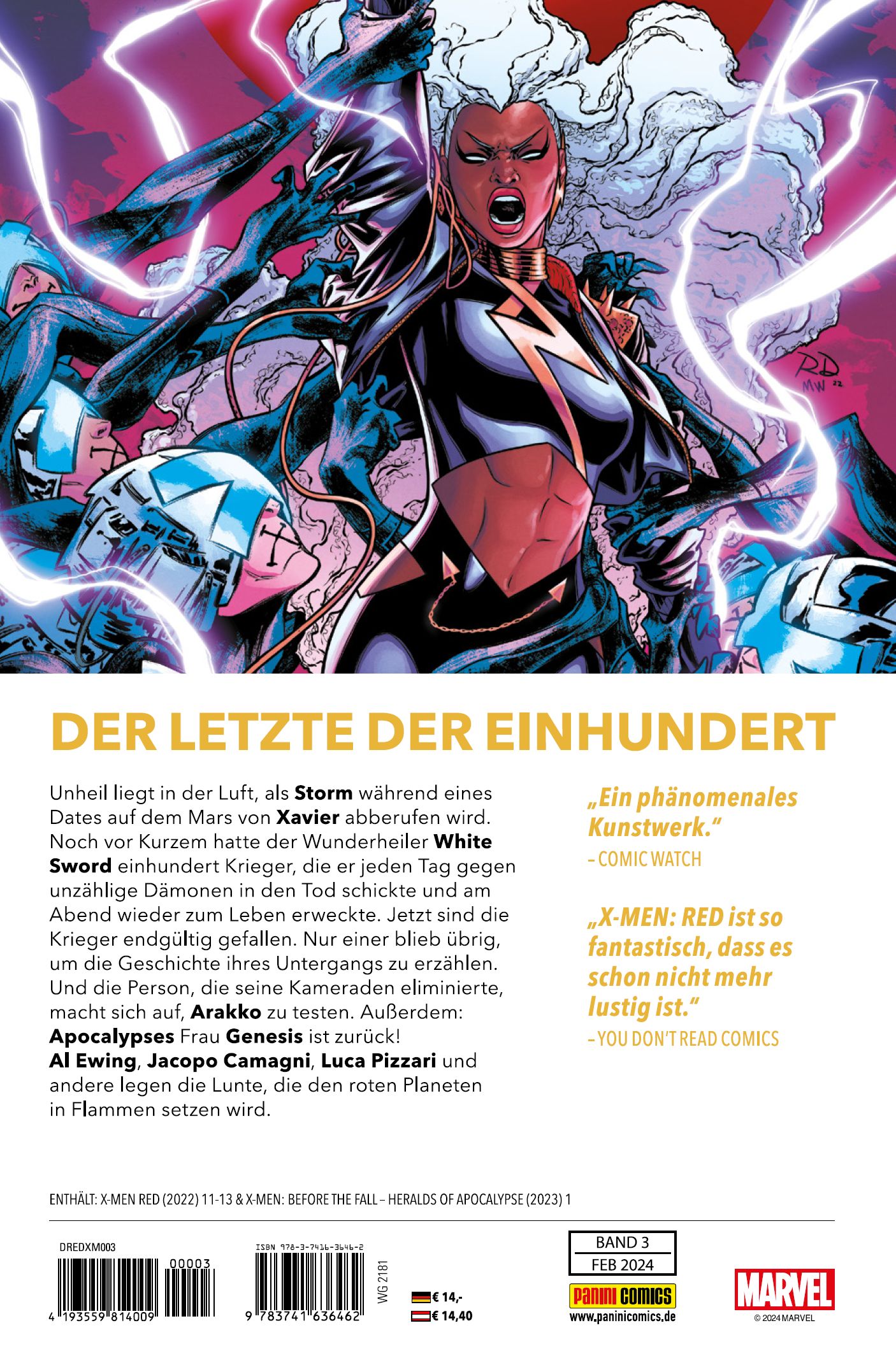 DER LETZTE DER EINHUNDERTUnheil liegt in der Luft, als Storm während eines Dates auf dem Mars von Xavier abberufen wird. Noch vor Kurzem hatte der Wunderheiler White Sword einhundert Krieger, die er jeden Tag gegen unzählige Dämonen in den Tod schickte, und am Abend wieder zum Leben erweckte. Jetzt sind die Krieger endgültig gefallen. Nur einer blieb übrig, um die Geschichte ihres Untergangs zu erzählen. Und die Person, die seine Kameraden eliminierte, macht sich auf, Arakko zu testen. Und: Apocalypses Frau Genesis ist zurück! Al Ewing, Jacopo Camagni, Luca Pizzari und andere legen die Lunte, die den roten Planeten in Flammen setzen wird.ENTHÄLT: X-MEN RED (2022) 11-13 & X-MEN: BEFORE THE FALL - HERALDS OF APOCALYPSE (2023) 1