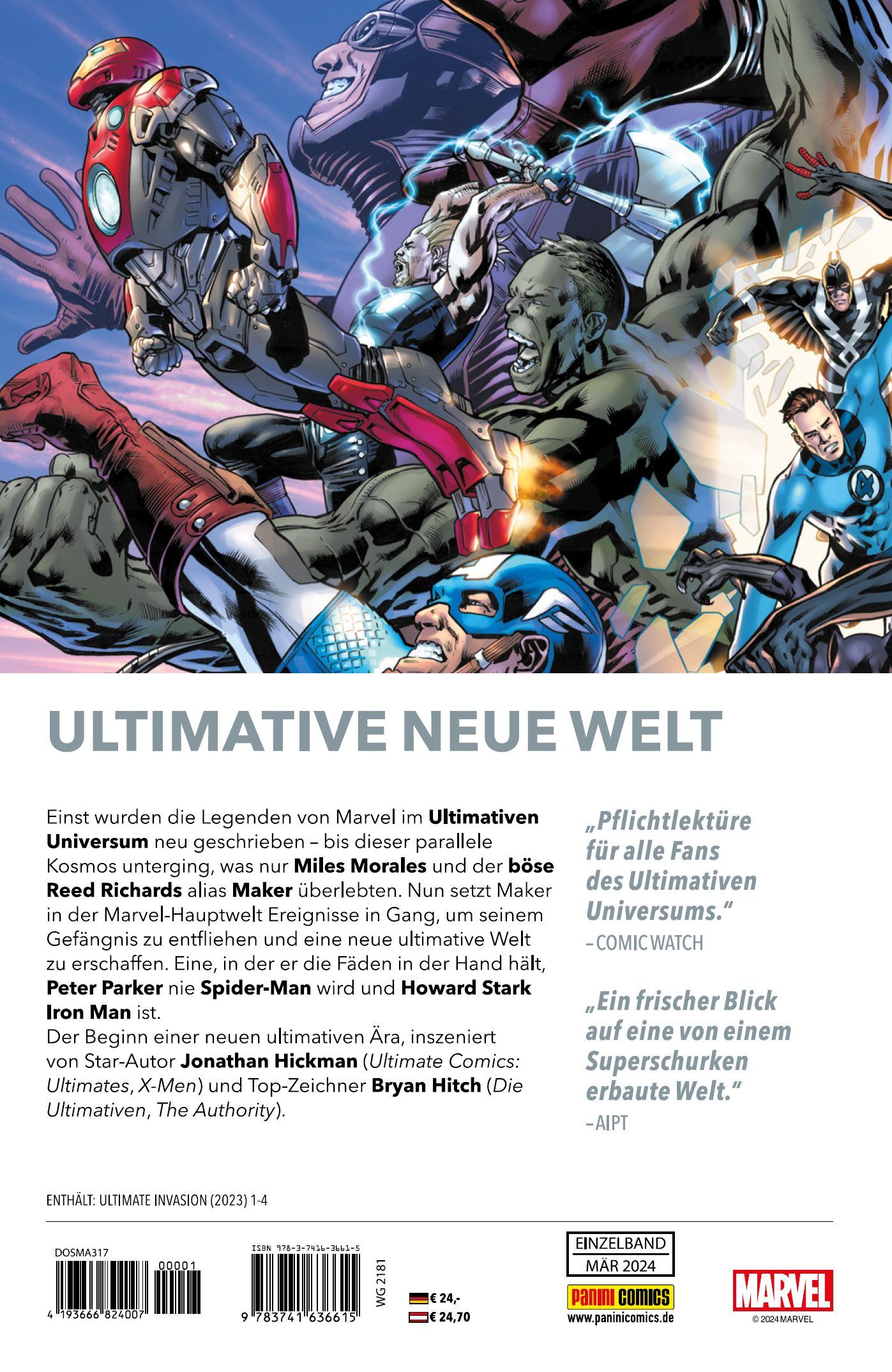 ULTIMATIVE NEUE WELTEinst wurden die Legenden von Marvel im Ultimativen Universum neu geschrieben - bis dieser parallele Kosmos unterging, was nur Miles Morales und der böse Reed Richards alias Maker überlebten. Nun setzt Maker in der Marvel-Hauptwelt Ereignisse in Gang, um seinem Gefängnis zu entfliehen und eine neue ultimative Welt zu erschaffen. Eine, in der er die Fäden in der Hand hält, Peter Parker nie Spider-Man wird und Howard Stark Iron Man ist. Der Beginn einer neuen ultimativen Ära, inszeniert von Star-Autor Jonathan Hickman (Ultimate Comics: Ultimates, X-Men) und Top-Zeichner Bryan Hitch (Die Ultimativen, The Authority).ENTHÄLT: ULTIMATE INVASION (2023) 1-4