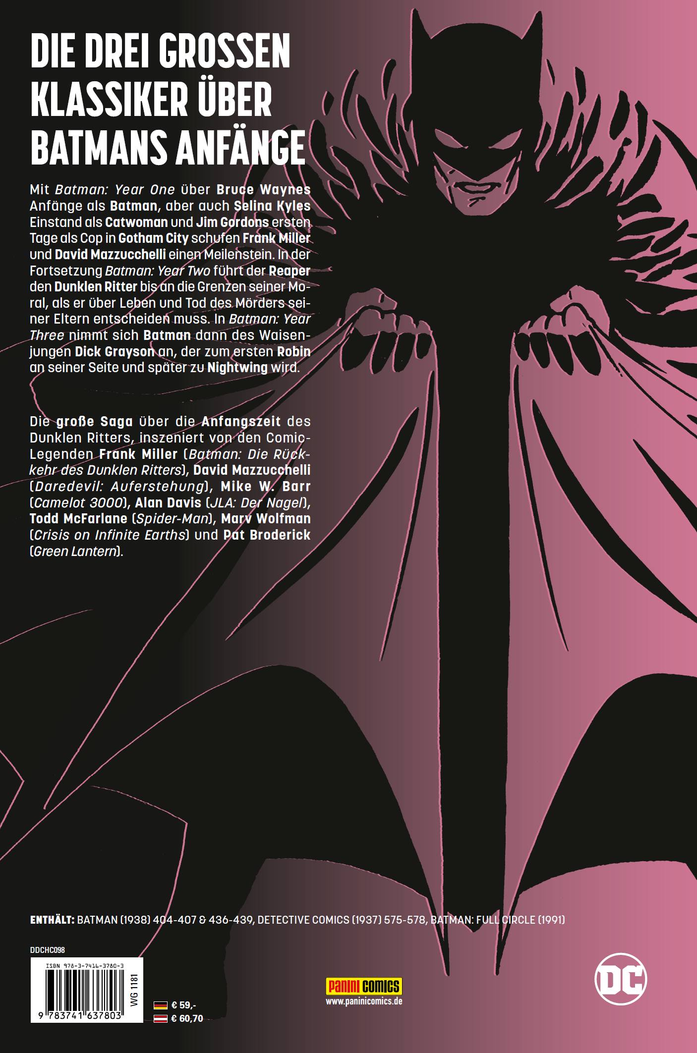 DIE DREI GROSSEN KLASSIKER ÜBER BATMANS ANFÄNGEMit Batman: Year One über Bruce Waynes Anfänge als Batman, aber auch Selina Kyles Einstand als Catwoman und Jim Gordons ersten Tage als Cop in Gotham City schufen Frank Miller und David Mazzucchelli einen Meilenstein. In der Fortsetzung Batman: Year Two führt der Reaper den Dunklen Ritter bis an die Grenzen seiner Moral, als er über Leben und Tod des Mörders seiner Eltern entscheiden muss. In Batman: Year Three nimmt sich Batman dann des Waisenjungen Dick Grayson an, der zum ersten Robin an seiner Seite und später zu Nightwing wird.Die große Saga über die Anfangszeit des Dunklen Ritters, inszeniert von den Comic-Legenden Frank Miller (Batman: Die Rückkehr des Dunklen Ritters), David Mazzucchelli (Daredevil: Auferstehung), Mike W. Barr (Camelot 3000), Alan Davis (JLA: Der Nagel), Todd McFarlane (Spider-Man), Marv Wolfman (Crisis on Infinite Earths) und Pat Broderick (Green Lantern).ENTHÄLT: BATMAN (1938) 404-407 & 436-439, DETECTIVE COMICS (1937) 575-578, BATMAN: FULL CIRCLE (1991)