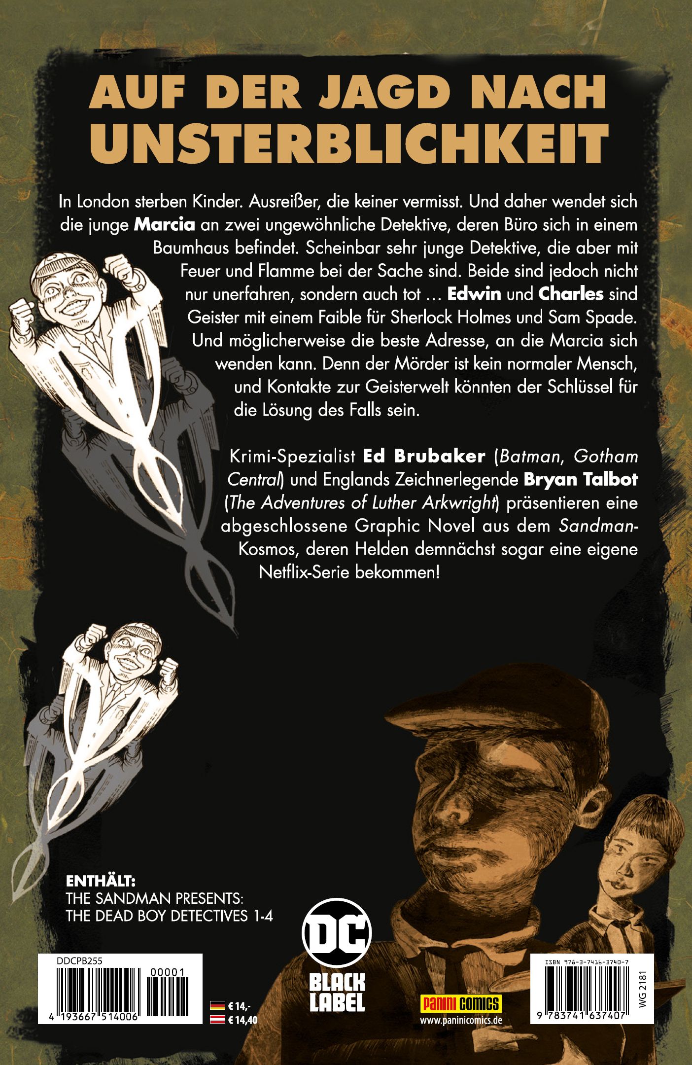 AUF DER JAGD NACH UNSTERBLICHKEITIn London sterben Kinder. Ausreißer, die keiner vermisst. Und daher wendet sich die junge Marcia an zwei ungewöhnliche Detektive, deren Büro sich in einem Baumhaus befindet. Scheinbar sehr junge Detektive, die aber mit Feuer und Flamme bei der Sache sind. Beide sind jedoch nicht nur unerfahren, sondern auch tot. Es sind Geister mit einem Faible für Sherlock Holmes und Sam Spade. Und möglicherweise die beste Adresse, an die Marcia sich wenden kann. Denn der Mörder ist kein normaler Mensch und Kontakte zur Geisterwelt könnten der Schlüssel für die Lösung des Falls sein ...Krimi-Spezialist Ed Brubaker (BATMAN, GOTHAM CENTRAL) und Englands Zeichnerlegende Bryan Talbot (The Adventures of Luther Arkwright) präsentieren eine abgeschlossene Graphic Novel aus dem SANDMAN-Kosmos, deren Helden eine eigene Netflix-Serie bekommen!ENTHÄLT: THE SANDMAN PRESENTS: THE DEAD BOY DETECTIVES 1-4