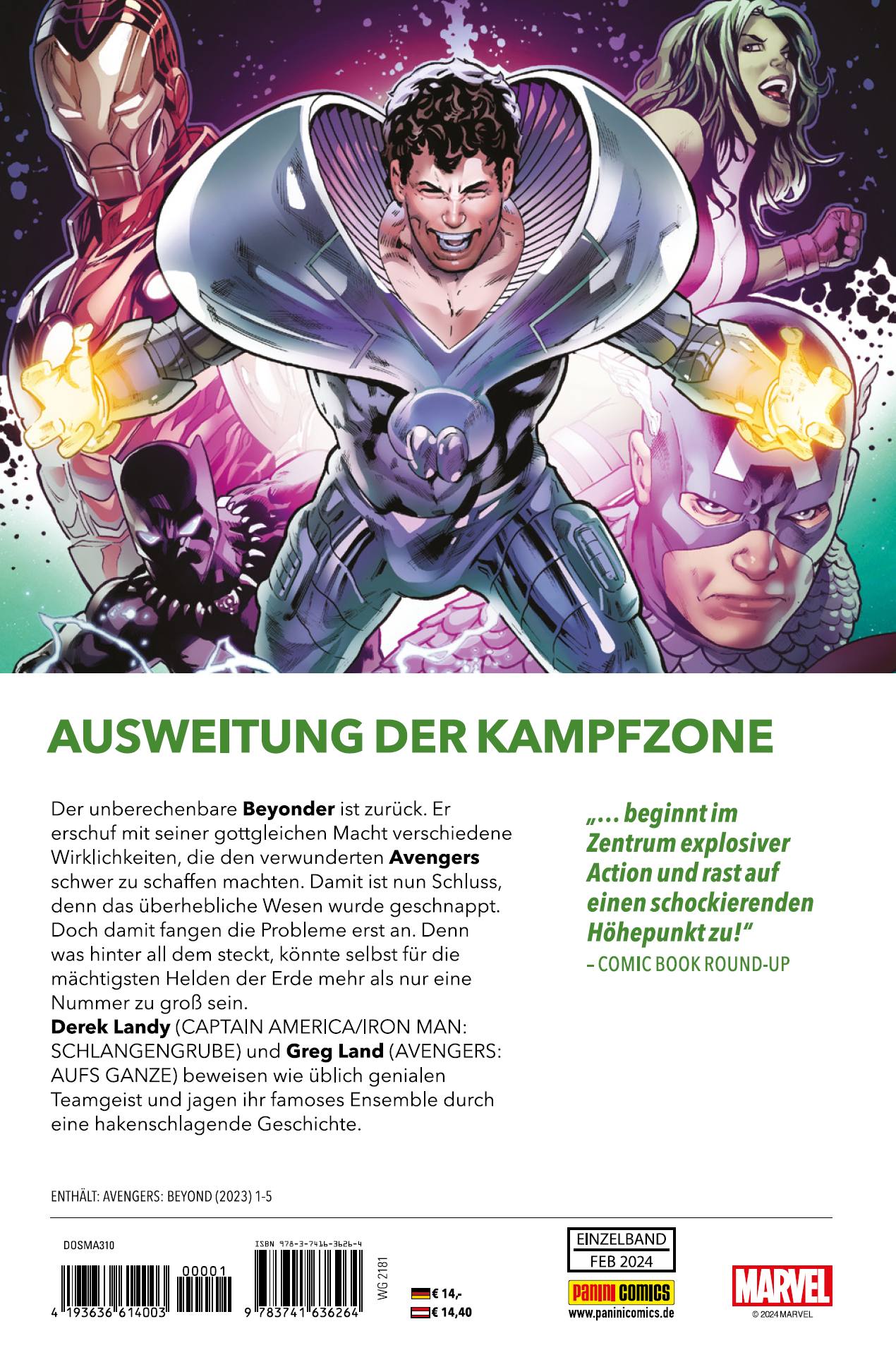 AUSWEITUNG DER KAMPFZONEDer unberechenbare Beyonder ist zurück. Er erschuf mit seiner gottgleichen Macht verschiedene Wirklichkeiten, die den verwunderten Avengers schwer zu schaffen machten. Damit ist nun Schluss, denn das überhebliche Wesen wurde geschnappt. Doch damit fangen die Probleme erst an. Denn was hinter all dem steckt, könnte selbst für die mächtigsten Helden der Erde mehr als nur eine Nummer zu groß sein. Derek Landy (CAPTAIN AMERICA/IRON MAN: SCHLANGENGRUBE) und Greg Land (AVENGERS: AUFS GANZE) beweisen wie üblich genialen Teamgeist und jagen ihr famoses Ensemble durch eine hakenschlagende Geschichte.ENTHÄLT: AVENGERS: BEYOND (2023) 1-5