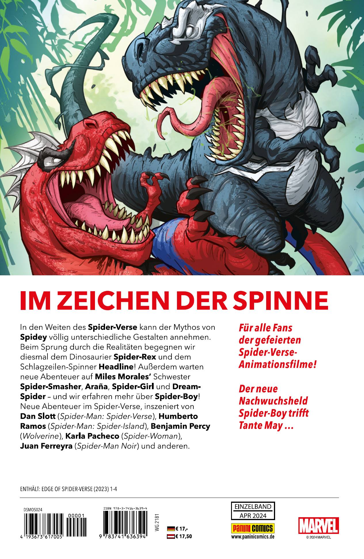IM ZEICHEN DER SPINNEIn den Weiten des Spider-Verse kann der Mythos von Spidey völlig unterschiedliche Gestalten annehmen. Beim Sprung durch die Realitäten begegnen wir diesmal dem Dinosaurier Spider-Rex und dem Schlagzeilen-Spinner Headline! Außerdem warten neue Abenteuer auf Miles Morales' Schwester Spider-Smasher, Araña, Spider-Girl und Dream-Spider - und wir erfahren mehr über Spider-Boy! Neue Abenteuer im Spider-Verse, inszeniert von Dan Slott (Spider-Man: Spider-Verse), Humberto Ramos (Spider-Man: Spider-Island), Benjamin Percy (Wolverine), Karla Pacheco (Spider-Woman), Juan Ferreyra (Spider-Man Noir) und anderen.ENTHÄLT: EDGE OF SPIDER-VERSE (2023) 1-4