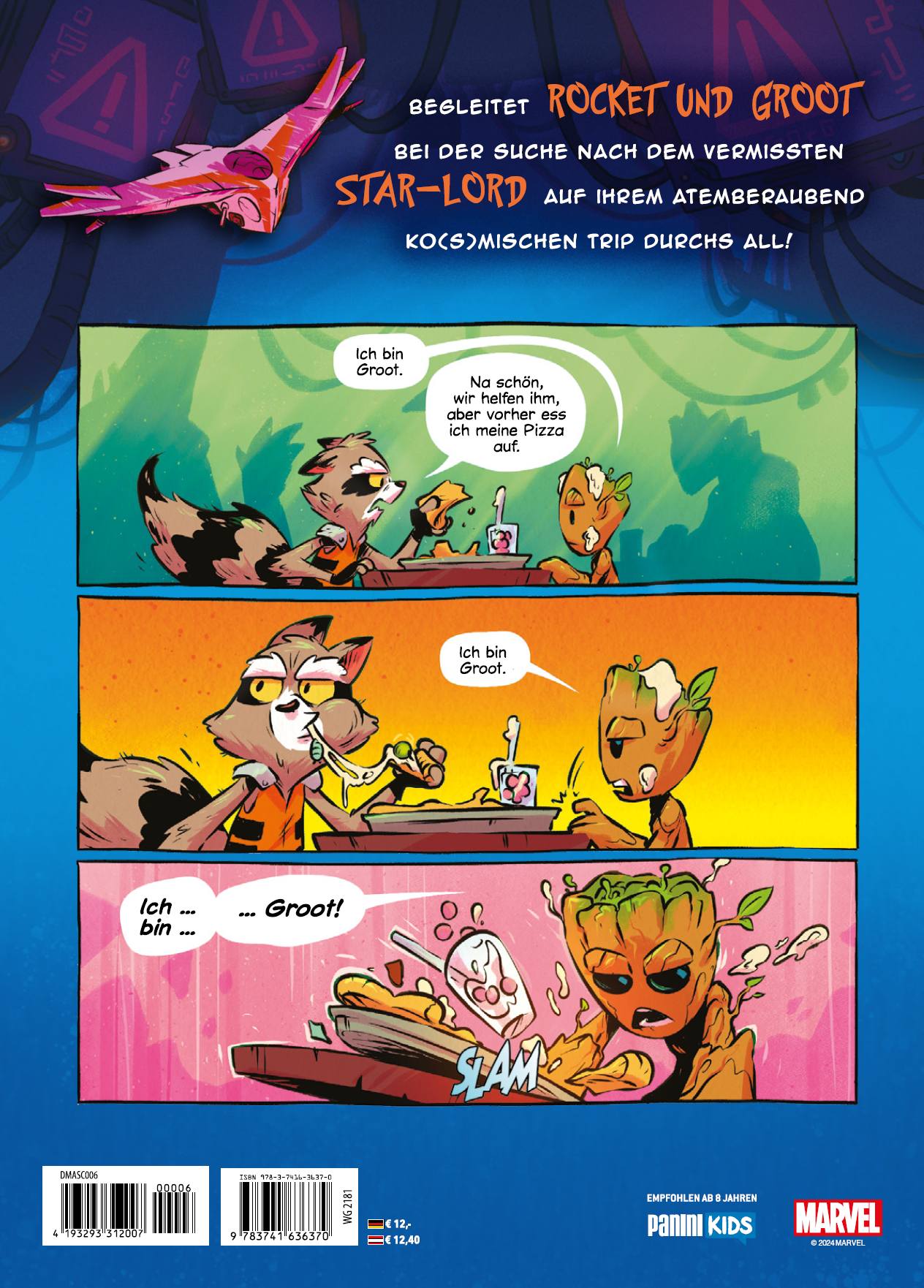 Die Guardians of the Galaxy sind Marvels oberste Weltraumwächter - und seit den gefeierten Verfilmungen mit Chris Pratt, Zoe Saldana, Dave Bautista und Co. nicht mehr aus unserer Pop-Kultur wegzudenken! In diesem Comic gibt es nun eine neue turbulente Science-Fiction-Geschichte für Jung und Alt, die sich auf zwei der beliebtesten Guardians konzentriert: Weltraumwaschbär Rocket Raccoon und Baum-Alien Groot! Statt in Ruhe Pizza zu futtern, müssen die beiden den von Kopfgeldjägern entführten Star-Lord retten. Ihre Freundin Gamora könnte ihnen dabei eine große Hilfe sein, allerdings hat die gerade Stress mit ihrem finsteren Ziehvater Thanos. So oder so wartet auf Rocket und Groot ein abgeschlossenes, rasantes Abenteuer im All.
