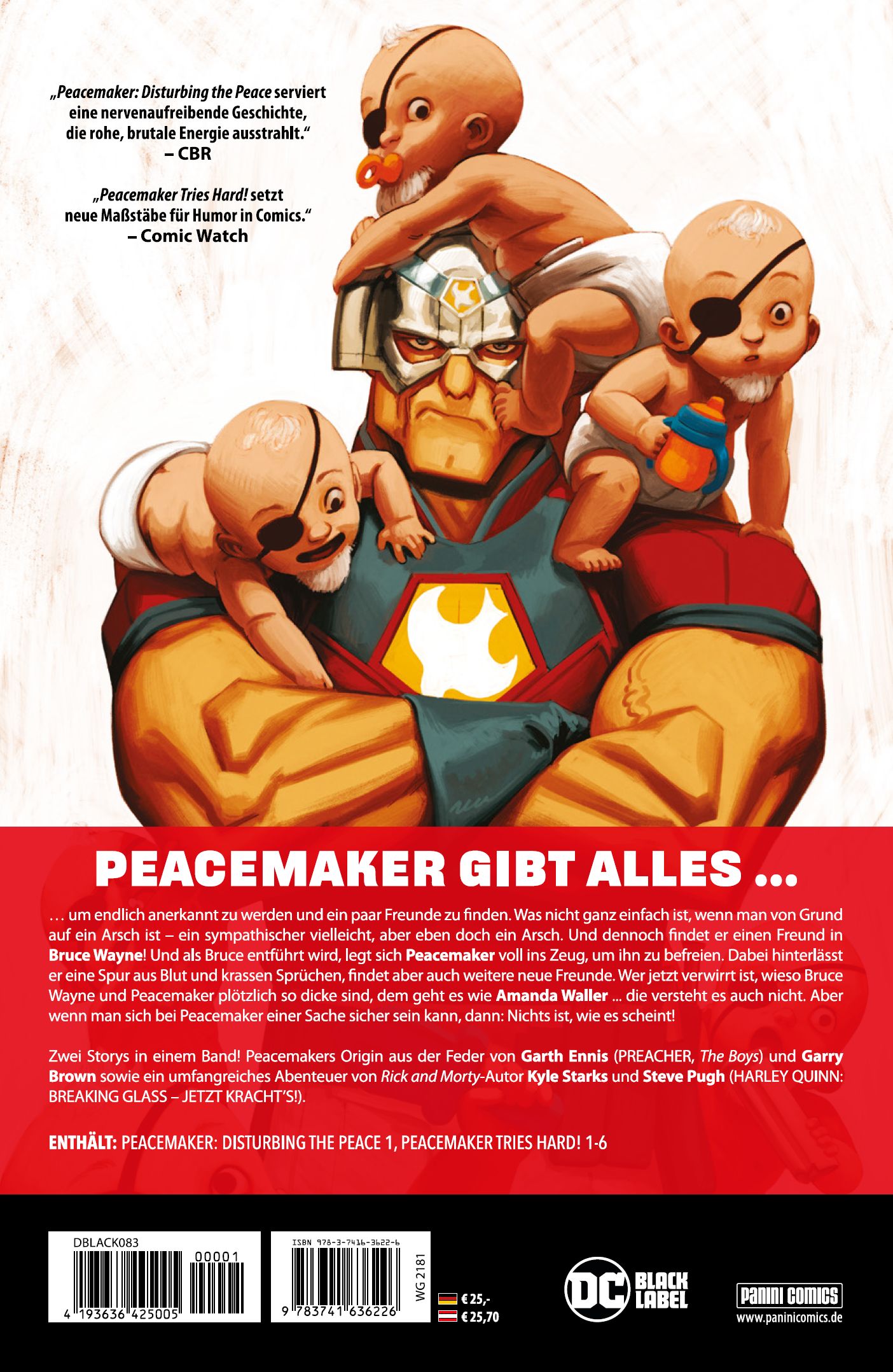 PEACEMAKER GIBT ALLES!... um endlich anerkannt zu werden und ein paar Freunde zu finden. Was nicht ganz einfach ist, wenn man von Grund auf ein Arsch ist - ein sympathischer vielleicht, aber eben doch ein Arsch. Und dennoch er findet einen Freund in Bruce Wayne! Und als Bruce entführt wird, legt sich Peacemaker voll ins Zeug, um ihn zu befreien. Dabei hinterlässt er eine Spur aus Blut und krassen Sprüchen, findet aber auch weitere neue Freunde. Wer jetzt verwirrt ist, wieso Bruce Wayne und Peacemaker plötzlich so dicke sind, dem geht es wie Amanda Waller ... die versteht es auch nicht. Aber wenn man sich bei Peacemaker einer Sache sicher sein kann, dann: Nichts ist, wie es scheint! Zwei Storys in einem Band! Peacemakers Origin aus der Feder von Garth Ennis (PREACHER, The Boys) und Garry Brown, sowie ein umfangreiches Abenteuer von Rick and Morty-Autor Kyle Starks und Steve Pugh (HARLEY QUINN: BREAKING GLASS - JETZT KRACHT'S!).ENTHÄLT: PEACEMAKER: DISTURBING THE PEACE 1, PEACEMAKER TRIES HARD! 1-6