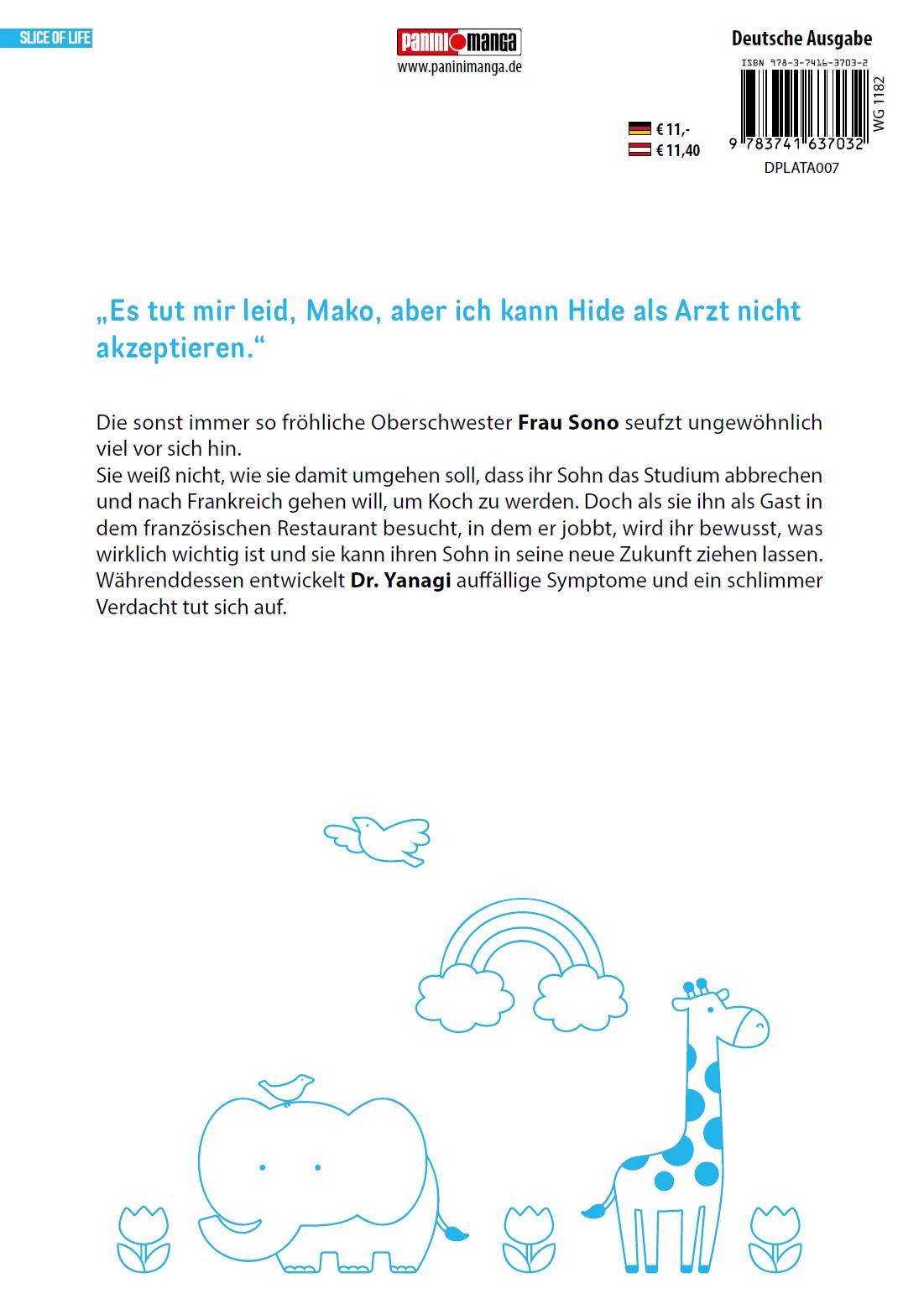 Erlebe das Leben eines Kinderarztes für Groß und Klein! Begleite Kinderarzt Mako Suzukake in seine Welt der Kinderheilkunde, in der die Kleinen erst dann auch gesund gepflegt sind, wenn er ihnen ein Lächeln auf ihr Gesicht zauber kann! Und manchmal bedeutet ein Kinderarzt zu sein auch nicht nur, dass man sich um die Sorgen der Kleinen, aber auch der Großen kümmert ... Das erwartet dich in Band 7: "Es tut mir leid, Mako, aber ich kann Hide als Arzt nicht akzeptieren."Die sonst immer so fröhliche Oberschwester Frau Sono seufzt ungewöhnlich viel vor sich hin. Sie weiß nicht, wie sie damit umgehen soll, dass ihr Sohn das Studium abbrechen und nach Frankreich gehen will, um Koch zu werden. Doch als sie ihn als Gast in dem französischen Restaurant besucht, in dem er jobbt, wird ihr bewusst, was wirklich wichtig ist und sie kann ihren Sohn in seine neue Zukunft ziehen lassen. Währenddessen entwickelt Takuro auffällige Symptome und ein schlimmer Verdacht tut sich auf. Für Fans von Slice-of-Life, Drama und rührenden Manga!