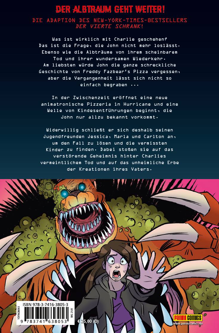 DER ALBTRAUM GEHT WEITER! DIE ADAPTION DES NEW-YORK-TIMES-BESTSELLERS Der vierte Schrank! Was ist wirklich mit Charlie geschehen? Das ist die Frage, die John nicht mehr loslässt. Ebenso wie die Albträume von ihrem scheinbarem Tod und ihrer wundersamen Wiederkehr. Am liebsten würde John die ganze schreckliche Geschichte von Freddy Fazbear's Pizza vergessen, aber die Vergangenheit lässt sich nicht so einfach begraben ... In der Zwischenzeit eröffnet eine neue animatronische Pizzeria in Hurricane und eine Welle von Kindesentführungen beginnt, die John nur allzu bekannt vorkommt. Widerwillig schließt er sich deshalb seinen Jugendfreunden Jessica, Marla und Carlton an, um den Fall zu lösen und die vermissten Kinder zu finden. Dabei stoßen sie auf das verstörende Geheimnis hinter Charlies vermeintlichem Tod und auf das unheimliche Erbe der Kreationen ihres Vaters.
