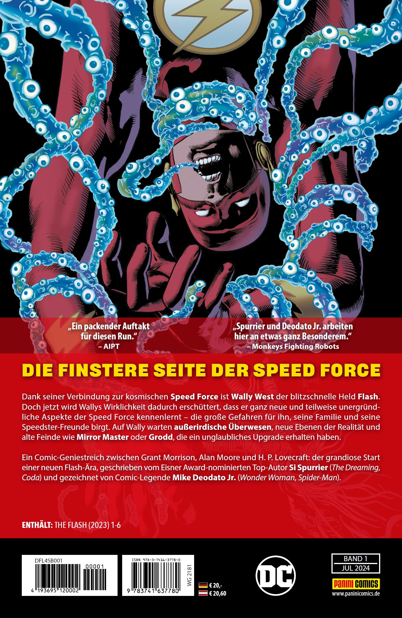 DIE FINSTERE SEITE DER SPEED FORCE Dank seiner Verbindung zur kosmischen Speed Force ist Wally West der blitzschnelle Held Flash. Doch jetzt wird Wallys Wirklichkeit dadurch erschüttert, dass er ganz neue und teilweise unergründliche Aspekte der Speed Force kennenlernt - die große Gefahren für ihn, seine Familie und seine Speedster-Freunde birgt. Auf Wally warten außerirdische Überwesen, neue Ebenen der Realität und alte Feinde wie Mirror Master oder Grodd, die ein unglaubliches Upgrade erhalten haben. Ein Comic-Geniestreich zwischen Grant Morrison, Alan Moore und H. P. Lovecraft: der grandiose Start einer neuen Flash-Ära, geschrieben vom Eisner Award-nominierten Top-Autor Si Spurrier (The Dreaming, Coda) und gezeichnet von Comic-Legende Mike Deodato Jr. (Wonder Woman, Spider-Man). ENTHÄLT: THE FLASH (2023) 1-6