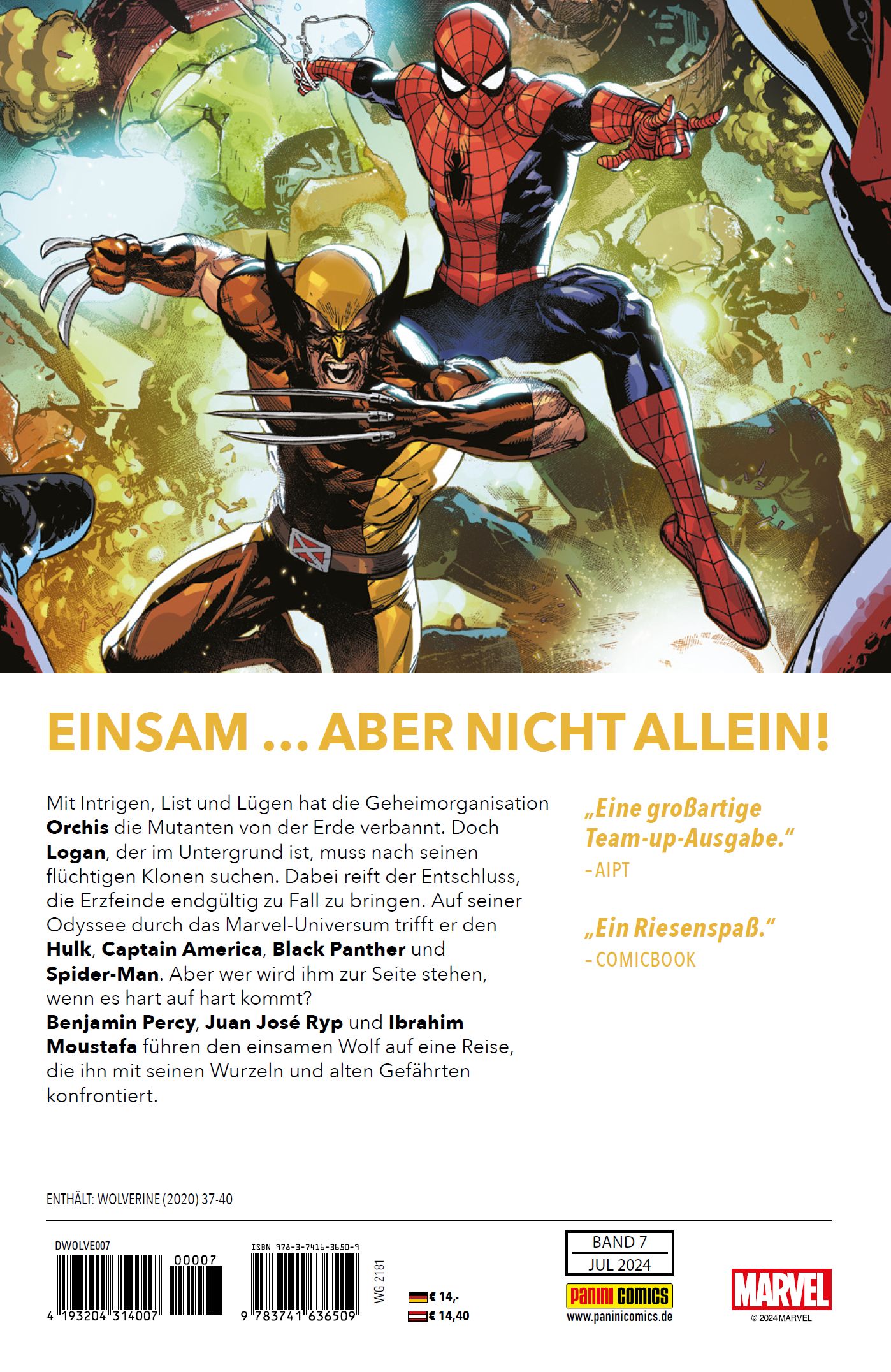 EINSAM ... ABER NICHT ALLEIN!Mit Intrigen, List und Lügen hat die Geheimorganisation Orchis die Mutanten von der Erde verbannt. Doch Logan, der im Untergrund ist, muss nach seinen flüchtigen Klonen suchen. Dabei reift der Entschluss, die Erzfeinde endgültig zu Fall zu bringen. Auf seiner Odyssee durch das Marvel-Universum trifft er den Hulk, Captain America, Black Panther und Spider-Man. Aber wer wird ihm zur Seite stehen, wenn es hart auf hart kommt? Benjamin Percy, Juan José Ryp und Ibrahim Moustafa führen den einsamen Wolf auf eine Reise, die ihn mit seinen Wurzeln und alten Gefährten konfrontiert.ENTHÄLT: WOLVERINE (2020) 37-40