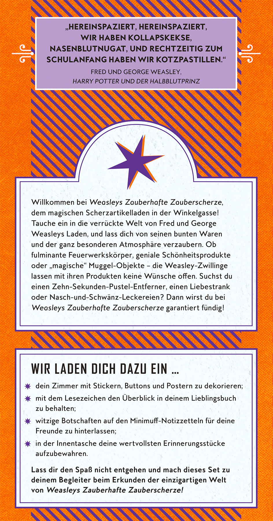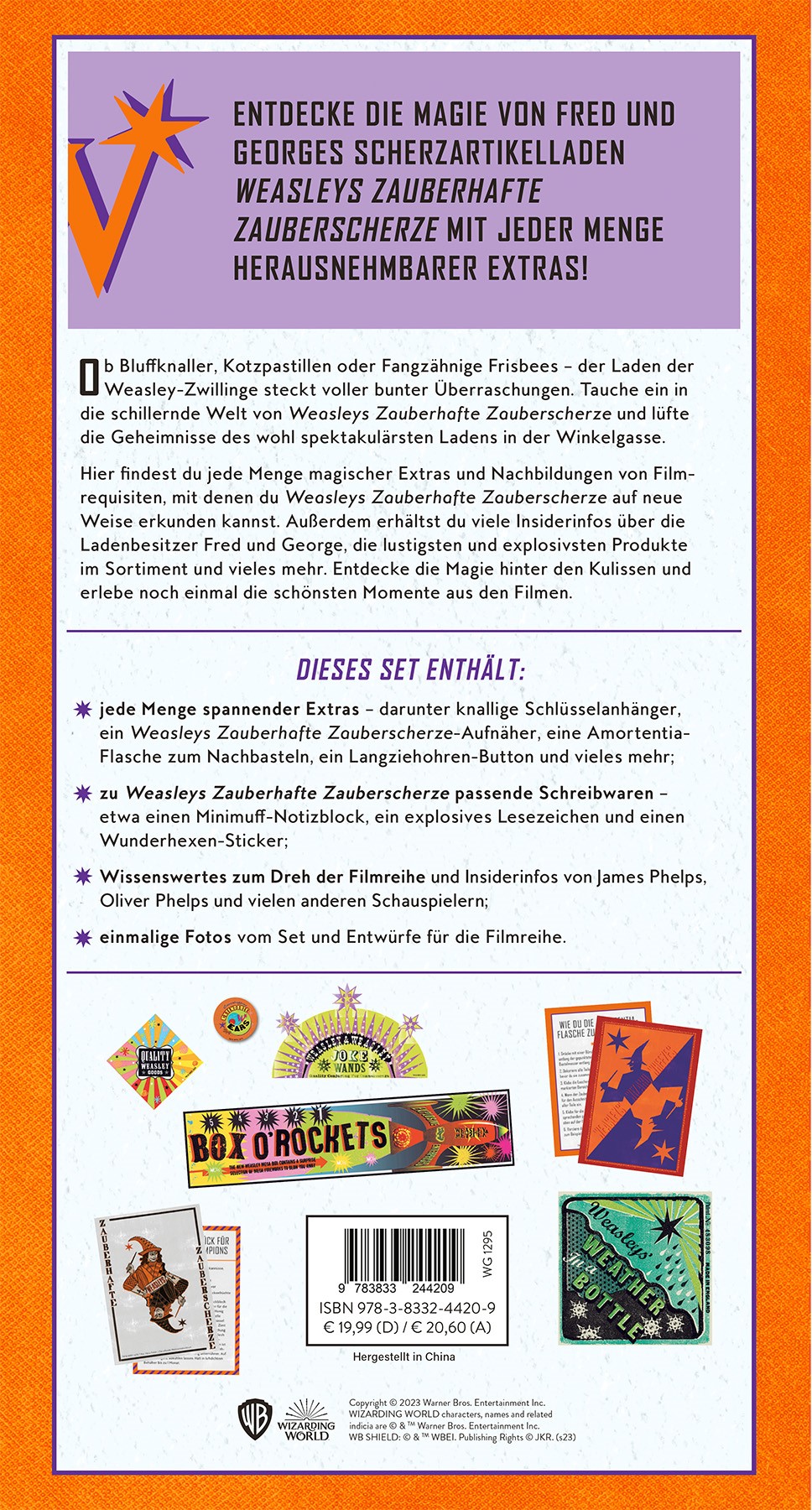 Entdecke die Magie von Fred und Georges Scherzartikelladen "Weasleys Zauberhafte Zauberscherze" mit diesem aufklappbaren Set mit vielen Extras!Das Set enthält: - jede Menge spannender Extras - darunter knallige Schlüsselanhänger, ein Weasleys "Zauberhafte Zauberscherze"-Aufnäher, eine Amortentia-Flasche zum Nachbasteln, ein Langziehohren-Button und vieles mehr;- zu "Weasleys Zauberhafte Zauberscherze" passende Schreibwaren - etwa einen Minimuff-Notizblock, ein explosives Lesezeichen und einen Wunderhexen-Sticker;- Wissenswertes zum Dreh der Filmreihe und Insiderinfos von James Phelps, Oliver Phelps und vielen anderen Schauspielern;- einmalige Fotos vom Set und Entwürfe für die Filmreihe.