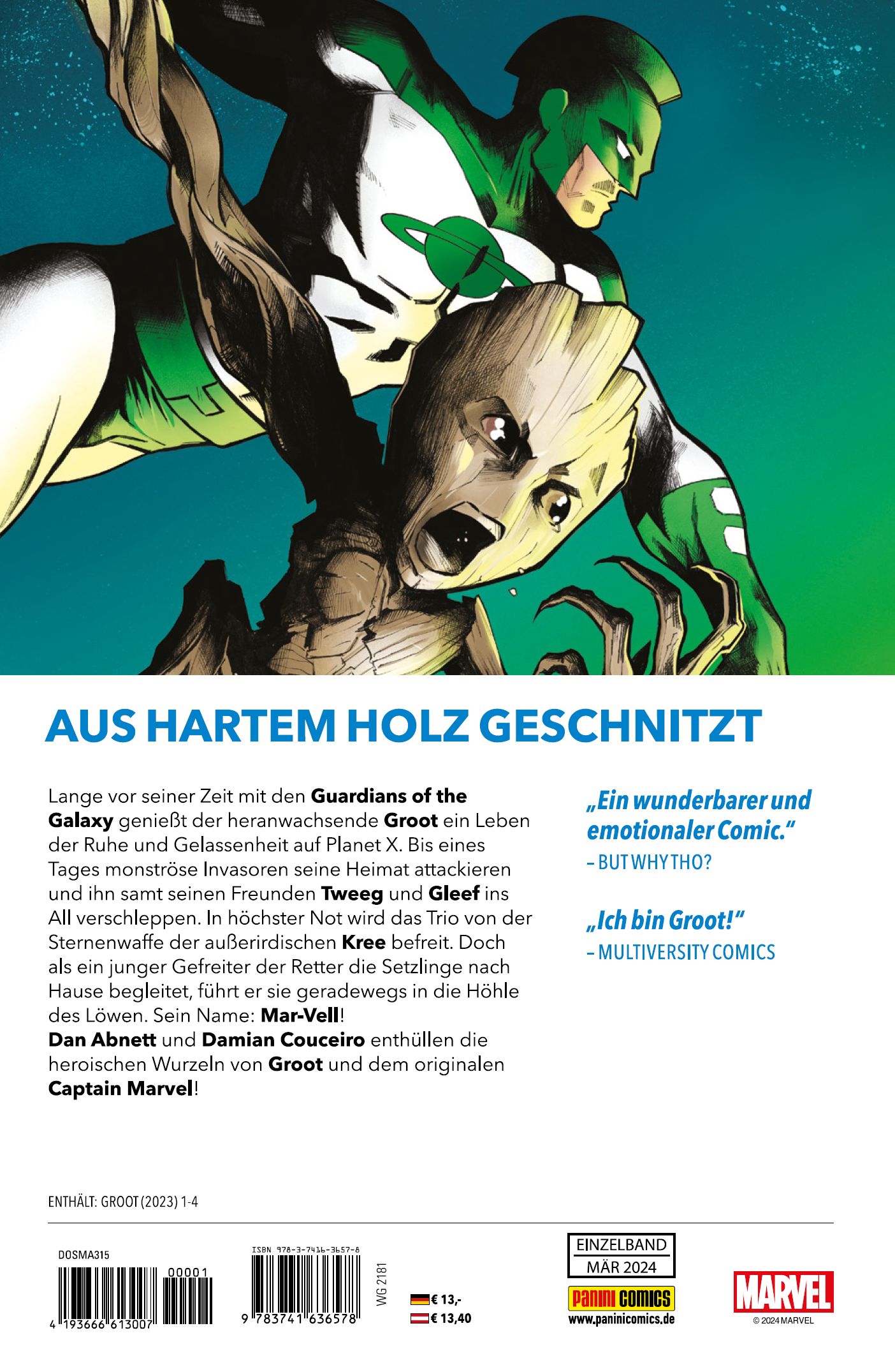 AUS HARTEM HOLZ GESCHNITZTLange vor seiner Zeit mit den Guardians of the Galaxy genießt der heranwachsende Groot ein Leben der Ruhe und Gelassenheit auf Planet X. Bis eines Tages monströse Invasoren seine Heimat attackieren und ihn samt seinen Freunden Tweeg und Gleef ins All verschleppen. In höchster Not wird das Trio von der Sternenwaffe der außerirdischen Kree befreit. Doch als ein junger Gefreiter der Retter die Setzlinge nach Hause begleitet, führt er sie geradewegs in die Höhle des Löwen. Sein Name: Mar-Vell! Dan Abnett und Damian Couceiro enthüllen die heroischen Wurzeln von Groot und dem originalen Captain Marvel!ENTHÄLT: GROOT (2023) 1-4