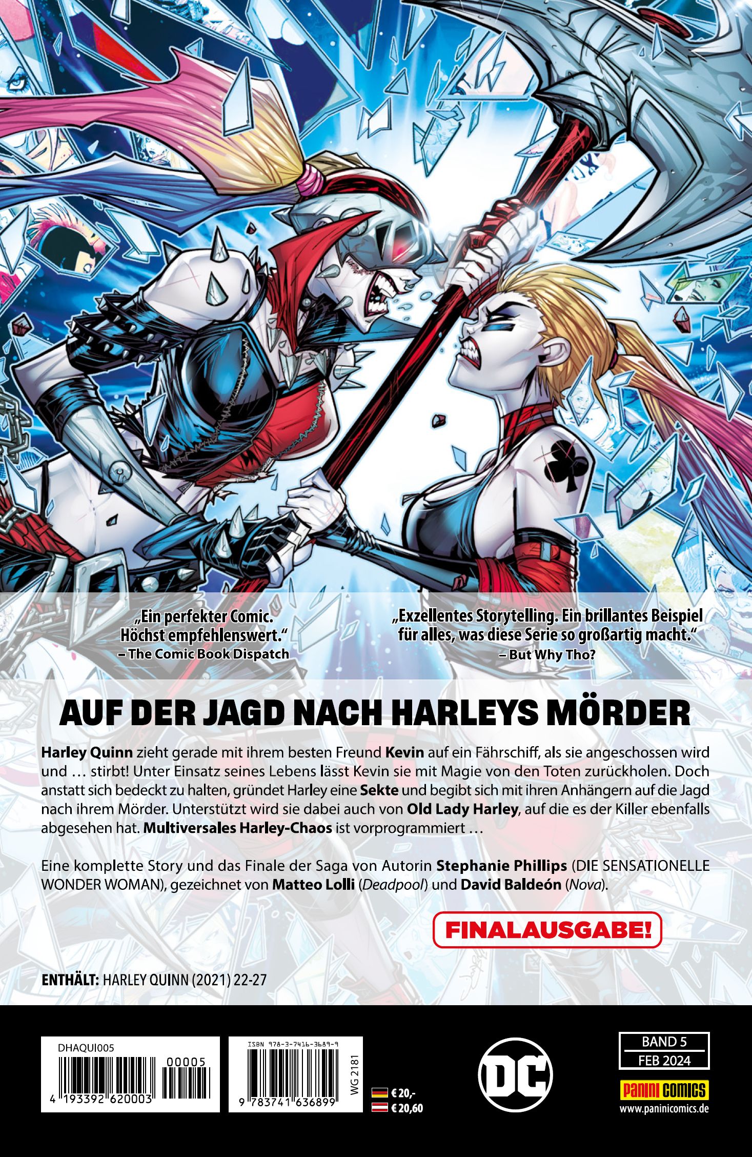 AUF DER JAGD NACH HARLEYS MÖRDERHarley Quinn zieht gerade mit ihrem besten Freund Kevin auf ein Fährschiff, als sie angeschossen wird und ... stirbt! Unter Einsatz seines Lebens lässt Kevin sie mit Magie von den Toten zurückholen. Doch anstatt sich bedeckt zu halten, gründet Harley eine Sekte und begibt sich mit ihren Anhängern auf die Jagd nach ihrem Mörder. Unterstützt wird sie dabei auch von Old Lady Harley, auf die es der Killer ebenfalls abgesehen hat. Multiversales Harley-Chaos ist vorprogrammiert ...Eine komplette Story und das Finale der Saga von Autorin Stephanie Phillips (DIE SENSATIONELLE WONDER WOMAN), gezeichnet von Matteo Lolli (Deadpool) und David Baldeón (Nova).ENTHÄLT: HARLEY QUINN (2021) 22-27FINALAUSGABE!