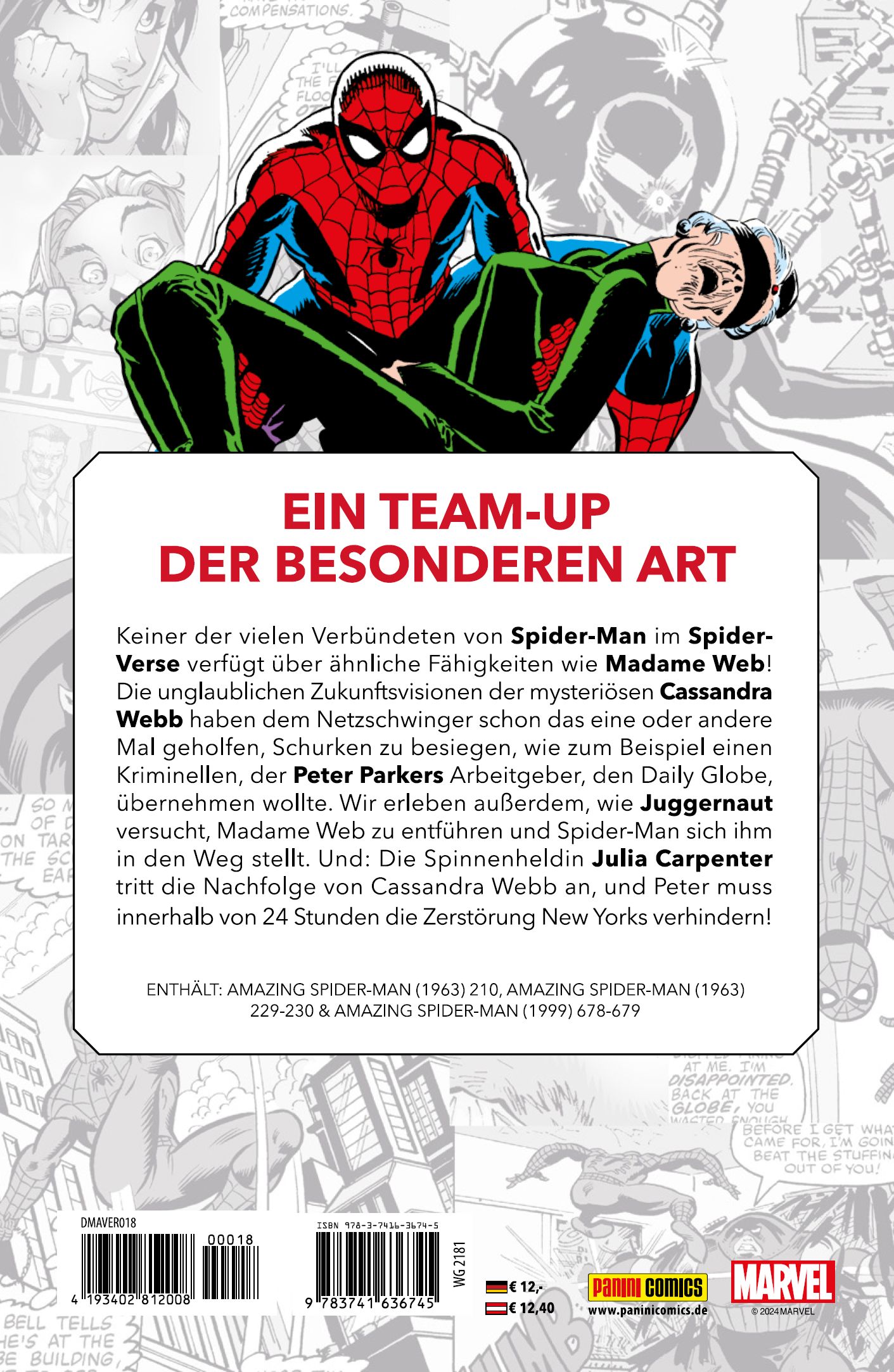 EIN TEAM-UP DER BESONDEREN ARTKeiner der vielen Verbündeten von Spider-Man im Spider- Verse verfügt über ähnliche Fähigkeiten wie Madame Web! Die unglaublichen Zukunftsvisionen der mysteriösen Cassandra Webb haben dem Netzschwinger schon das eine oder andere Mal geholfen, Schurken zu besiegen, wie zum Beispiel einen Kriminellen, der Peter Parkers Arbeitgeber, den Daily Globe, übernehmen wollte. Wir erleben außerdem, wie Juggernaut versucht, Madame Web zu entführen und Spider-Man sich ihm in den Weg stellt. Und: Die Spinnenheldin Julia Carpenter tritt die Nachfolge von Cassandra Webb an und Peter muss innerhalb von 24 Stunden die Zerstörung New Yorks verhindern! ENTHÄLT: AMAZING SPIDER-MAN (1963) 210, AMAZING SPIDER-MAN (1963) 229-230 & AMAZING SPIDER-MAN (1999) 678-679