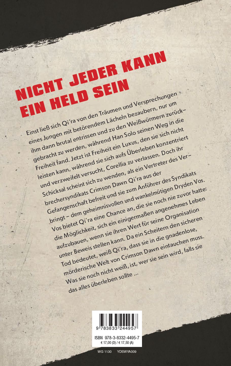 NICHT JEDER KANN EIN HELD SEIN Einst ließ sich Qi'ra von den Träumen und Versprechungen eines Jungen mit betörendem Lächeln bezaubern, nur um ihm dann brutal entrissen und zu den Weißwürmern zurückgebracht zu werden, während Han Solo seinen Weg in die Freiheit fand. Jetzt ist Freiheit ein Luxus, den sie sich nicht leisten kann, während sie sich aufs Überleben konzentriert und verzweifelt versucht, Corellia zu verlassen. Doch ihr Schicksal scheint sich zu wenden, als ein Vertreter des Verbrechersyndikats Crimson Dawn Qi'ra aus der Gefangenschaf t befreit und sie zum Anführer des Syndikats bringt - dem geheimnisvollen und wankelmütigen Dryden Vos. Vos bietet Qi'ra eine Chance an, die sie noch nie zuvor hatte: die Möglichkeit, sich ein einigermaßen angenehmes Leben aufzubauen, wenn sie ihren Wert für seine Organisation unter Beweis stellen kann. Da ein Scheitern den sicheren Tod bedeutet, weiß Qi'ra, dass sie in die gnadenlose, mörderische Welt von Crimson Dawn eintauchen muss. Was sie noch nicht weiß, ist, wer sie sein wird, falls sie das alles überleben sollte ...