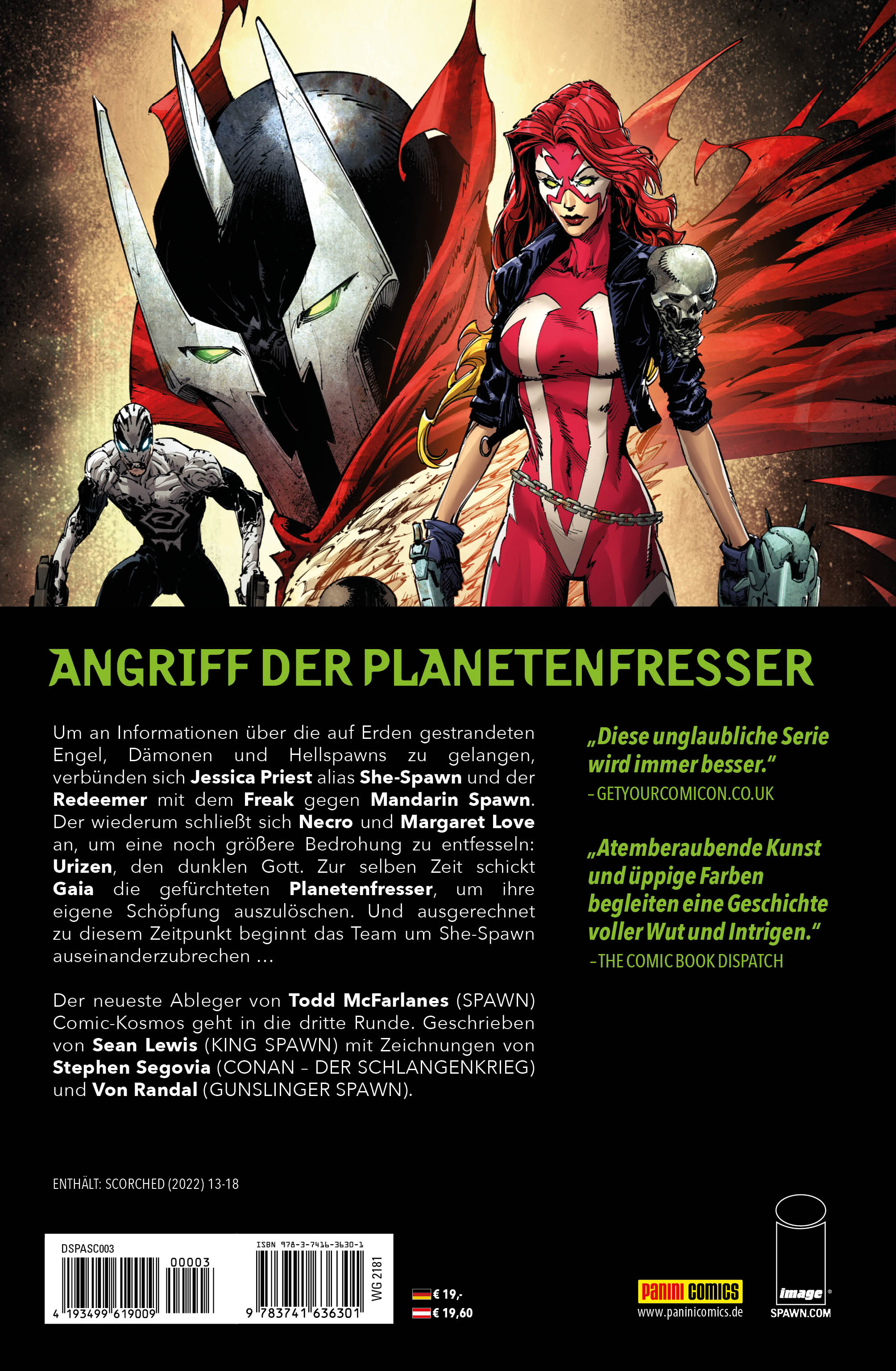 ANGRIFF DER PLANETENFRESSERUm an Informationen über die auf Erden gestrandeten Engel, Dämonen und Hellspawns zu gelangen, verbünden sich Jessica Priest alias She-Spawn und der Redeemer mit dem Freak gegen Mandarin Spawn. Der wiederum schließt sich Necro und Margaret Love an, um eine noch größere Bedrohung zu entfesseln: Urizen, den dunklen Gott. Zur selben Zeit schickt Gaia die gefürchteten Planetenfresser, um ihre eigene Schöpfung auszulöschen. Und ausgerechnet zu diesem Zeitpunkt beginnt das Team um She-Spawn auseinanderzubrechen ... Der neueste Ableger von Todd McFarlanes (SPAWN) Comic-Kosmos geht in die dritte Runde. Geschrieben von Sean Lewis (KING SPAWN) mit Zeichnungen von Stephen Segovia (CONAN - DER SCHLANGENKRIEG) und Von Randal (GUNSLINGER SPAWN).ENTHÄLT: SCORCHED (2022) 13-18