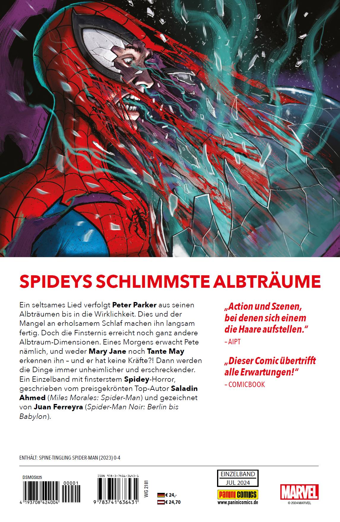 SPIDEYS SCHLIMMSTE ALBTRÄUMEEin seltsames Lied verfolgt Peter Parker aus seinen Albträumen bis in die Wirklichkeit. Dies und der Mangel an erholsamem Schlaf machen ihn langsam fertig. Doch die Finsternis erreicht noch ganz andere Albtraum-Dimensionen. Eines Morgens erwacht Pete nämlich, und weder Mary Jane noch Tante May erkennen ihn - und er hat keine Kräfte?! Dann werden die Dinge immer unheimlicher und erschreckender. Ein Einzelband mit finsterstem Spidey-Horror, geschrieben vom preisgekrönten Top-Autor Saladin Ahmed (Miles Morales: Spider-Man) und gezeichnet von Juan Ferreyra (Spider-Man Noir: Berlin bis Babylon).ENTHÄLT: SPINE-TINGLING SPIDER-MAN (2023) 0-4