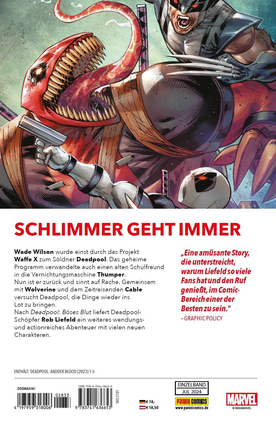 SCHLIMMER GEHT IMMERWade Wilson wurde einst durch das Projekt Waffe X zum Söldner Deadpool. Das geheime Programm verwandelte auch einen alten Schulfreund in die Vernichtungsmaschine Thumper. Nun ist er zurück und sinnt auf Rache. Gemeinsam mit Wolverine und dem Zeitreisenden Cable versucht Deadpool, die Dinge wieder ins Lot zu bringen. Nach Deadpool: Böses Blut liefert Deadpool-Schöpfer Rob Liefeld ein weiteres wendungsund actionreiches Abenteuer mit vielen neuen Charakteren.ENTHÄLT: DEADPOOL: BADDER BLOOD (2023) 1-5