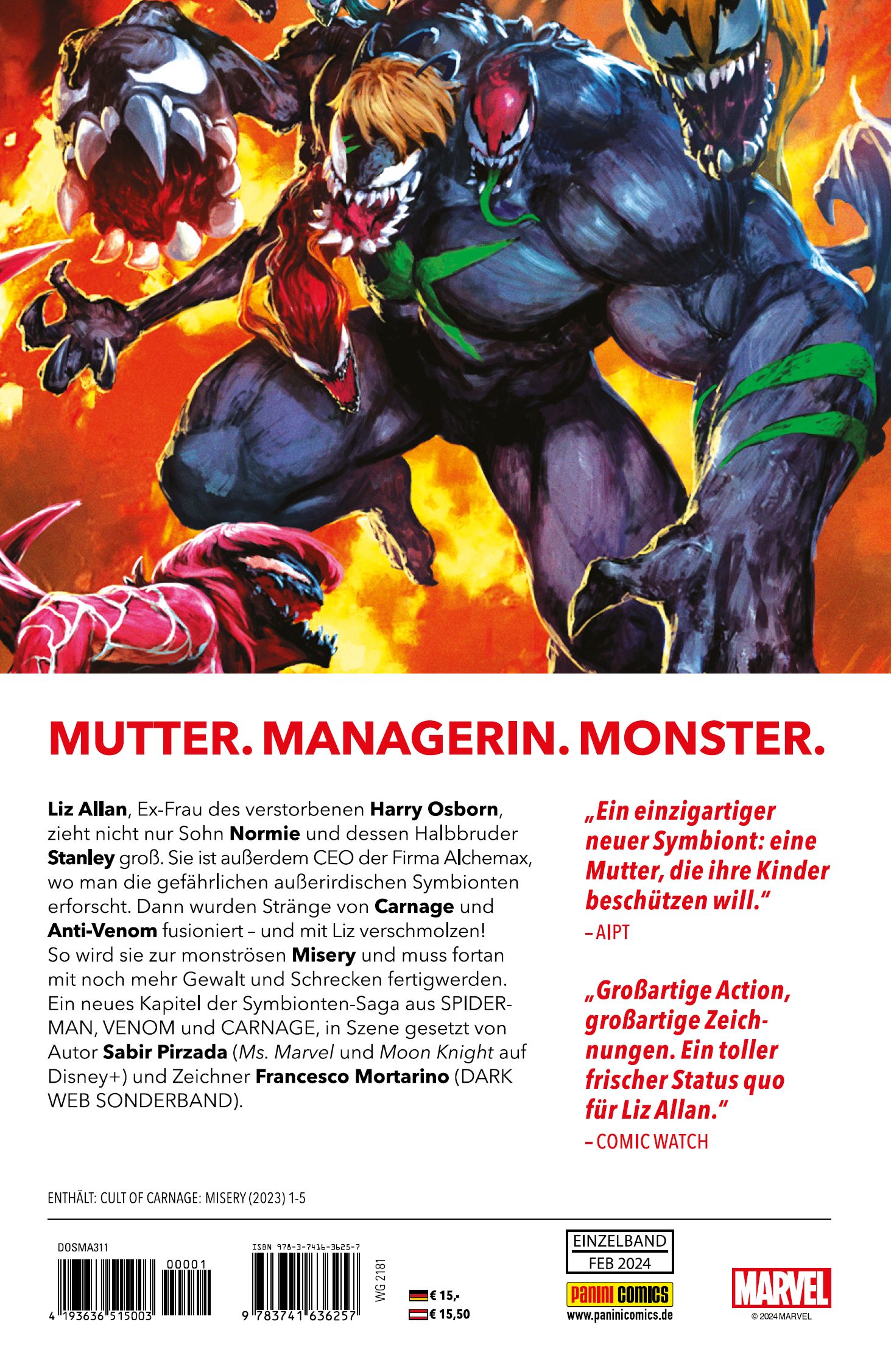 MUTTER. MANAGERIN. MONSTER.Liz Allan, Ex-Frau des verstorbenen Harry Osborn, zieht nicht nur Sohn Normie und dessen Halbbruder Stanley groß. Sie ist außerdem CEO der Firma Alchemax, wo man die gefährlichen außerirdischen Symbionten erforscht. Dann wurden Stränge von Carnage und Anti-Venom fusioniert - und danach Liz verschmolzen! So wird sie zur monströsen Misery und muss fortan mit noch mehr Gewalt und Schrecken fertigwerden. Ein neues Kapitel der Symbionten-Saga aus SPIDERMAN, VENOM und CARNAGE, in Szene gesetzt von Autor Sabir Pirzada (Ms. Marvel und Moon Knight auf Disney+) und Zeichner Francesco Mortarino (DARK WEB SONDERBAND).ENTHÄLT: CULT OF CARNAGE: MISERY (2023) 1-5