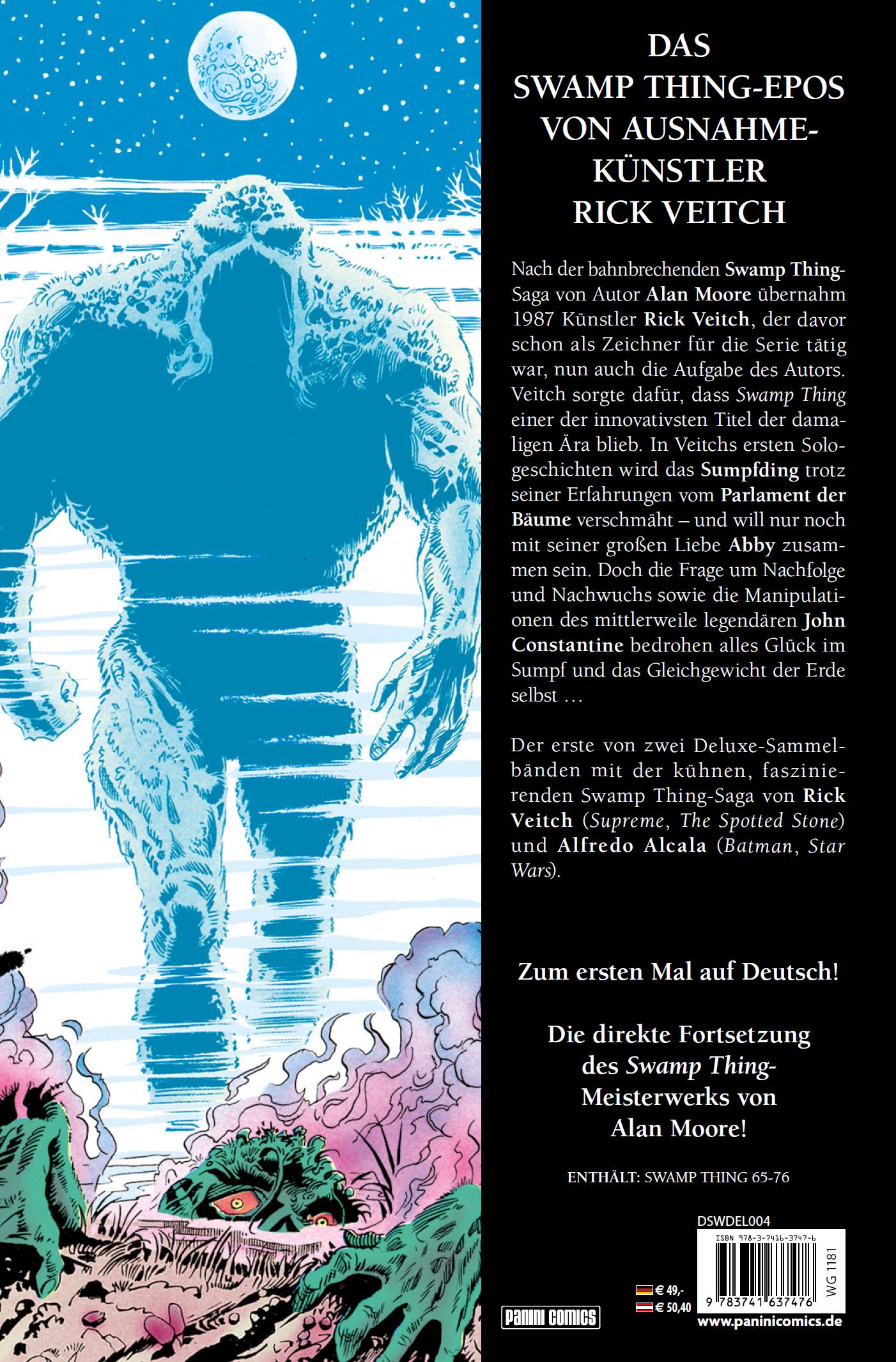 DAS SWAMP THING-EPOS VON AUSNAHME - KÜNSTLER RICK VEITCHNach der bahnbrechenden Swamp Thing-Saga von Autor Alan Moore übernahm 1987 Künstler Rick Veitch, der da vor schon als Zeichner für die Serie tätig war, nun auch die Aufgabe des Autors. Veitch sorgte dafür, dass Swamp Thing einer der innovativsten Titel der damaligen Ära blieb. In Veitchs ersten Sologeschichten wird das Sumpfding trotz seiner Erfahrungen vom Parlament der Bäume verschmäht - und will nur noch mit seiner großen Liebe Abby zusammen sein. Doch die Frage um Nachfolge und Nachwuchs sowie die Manipulationen des mittlerweile legendären John Constantine bedrohen alles Glück im Sumpf, und das Gleichgewicht der Erde selbst ...Der erste von zwei Deluxe-Sammelbänden mit der kühnen, faszinierenden Swamp Thing-Saga von Rick Veitch (Supreme, The Spotted Stone) und Alfredo Alcala (Batman, Star Wars) - die Fortsetzung von Alan Moores visionärem Horror-Klassik er in deutscher Erstveröffentlichung!Zum ersten Mal auf Deutsch!Die direkte Fortsetzung des Swamp Thing-Meisterwerks von Alan Moore!ENTHÄLT: SWAMP THING 65-76