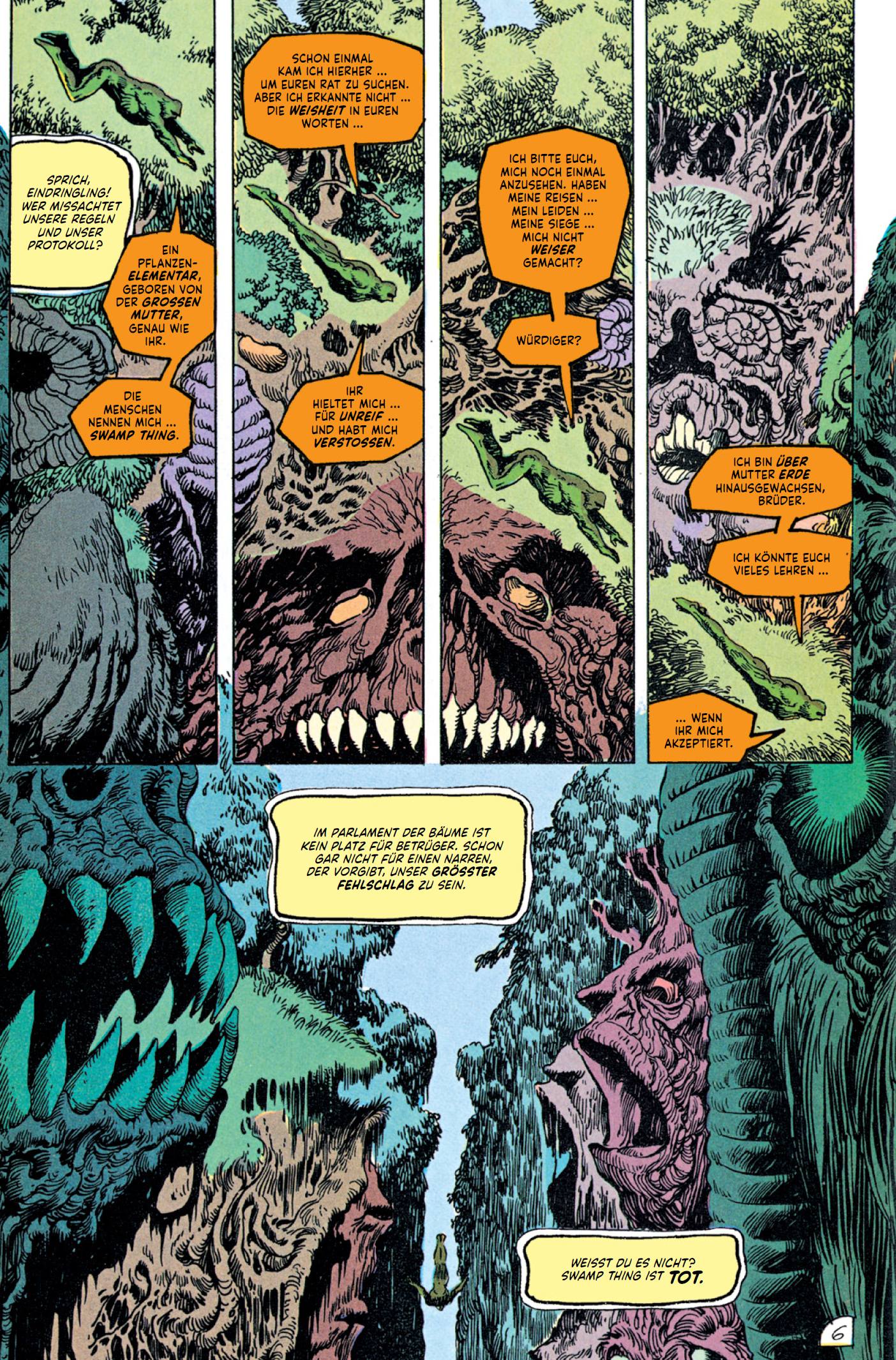 LEBEN UND LIEBEN IM GRÜN von Christian Endres Mit einer Horror-Kurzgeschichte bei DC Comics starteten Autor Len Wein und Künstler Bernie Wrightson im Jahr 1971 die Legende von Swamp Thing. Ein Jahr später entwickelte sich daraus die erste fortlaufende Swamp Thing-Comic-Serie. Zu Beginn verwandelte sich der Biologe Dr. Alec Holland nach einer Explosion seines Labors im Sumpf von Louisiana in das missverstandene „Sumpfding“. Als Pflanzenmonster durchstreifte er die Welt, fand im Hexenmeister Anton Arcane seinen Erzfeind und traf in Gotham City sogar auf Batman. Ab 1984 krempelte der britische Autor Alan Moore die Swamp Thing-Mythologie komplett um und führte den bis dahin recht klassischen Horror-Titel zu neuen Höhen – und damit das ganze Genre sowie das gesamte Medium. Moore erklärte Swamp Thing zu einem Elementarwesen, das Alecs Erinnerungen und Persönlichkeit absorbiert hatte. Ferner konfrontierte er das Ding aus dem Sumpf erstmals mit dem manipulativen Okkultisten John Constantine – und machte es zum Avatar des Grüns, des kollektiven Bewusstseins allen pflanzlichen Lebens auf der Erde beziehungsweise im Universum. Als dessen Champion konnte Swamp Thing durch die Pflanzen-Sphäre reisen (und nur seine Hülle am Ausgangspunkt zurücklassen) und erfuhr vom gestrengen Parlament der Bäume. Zudem bekam in Moores revolutionären Geschichten – gezeichnet von John Totleben, Stephen Bissette und anderen – das Monster das Mädchen! Denn Swamp Thing und Abby Cable gaben ihrer Liebe trotz aller Hürden nach, und vereinten sich durch psychedelischen Sex, für den Abby eine Frucht vom Pflanzenleib ihres Geliebten aß. Bahnbrechender Stoff, ob Monsterhorror oder Horror-Comic. Überdies fügte Moore dem Kanon Figuren wie den Hippie Chester Williams oder den Cajun Gene LaBostrie hinzu, reaktivierte die fiktive Autorin Liz Tremayne und erkor den Floronic Man alias Dr. Jason Woodrue zu einem wichtigen Gegenspieler. Letztlich ließ Moore Swamp Thing als mächtiges Pflanzenelementar bis ins All reisen, weshalb man es auf der Erde für tot hielt, obwohl es im September 1987 im letzten Kapitel von Moores Saga zur Wiedervereinigung mit Abby kam. Nach Moores Abschied galt es, große Fußstapfen auszufüllen. Mit Rick Veitch trat kein Unbekannter das Erbe an: Veitch hatte gegen Ende von Moores Epos lange als Hauptzeichner des wegweisenden Prestige-Titels fungiert, Swamp Things Odyssee durchs All bebildert und davor bereits 1985 an jenem Swamp Thing-Comic mitgewirkt, in dem Constantine seinen Einstand gegeben hatte (die erste Hellblazer-Comic-Serie sollte indes Anfang 1988 starten). Fortan kümmerte sich Mr. Veitch als Zeichner und als Autor um die Geschicke des nicht immer willigen Avatars des Grüns, wobei er vom meisterhaften Tuscher Alfredo Alcala unterstützt wurde. Sie behielten die Richtung, den Mut, die Ambitionen und die Themen bei, die Moore in den vermeintlichen Sumpf des Panel- Horrors eingeführt hatte. In diesem ersten Band des grenzerweiternden Runs von Rick Veitch präsentieren wir die direkte Fortsetzung von Moores Klassiker erstmals auf Deutsch.
