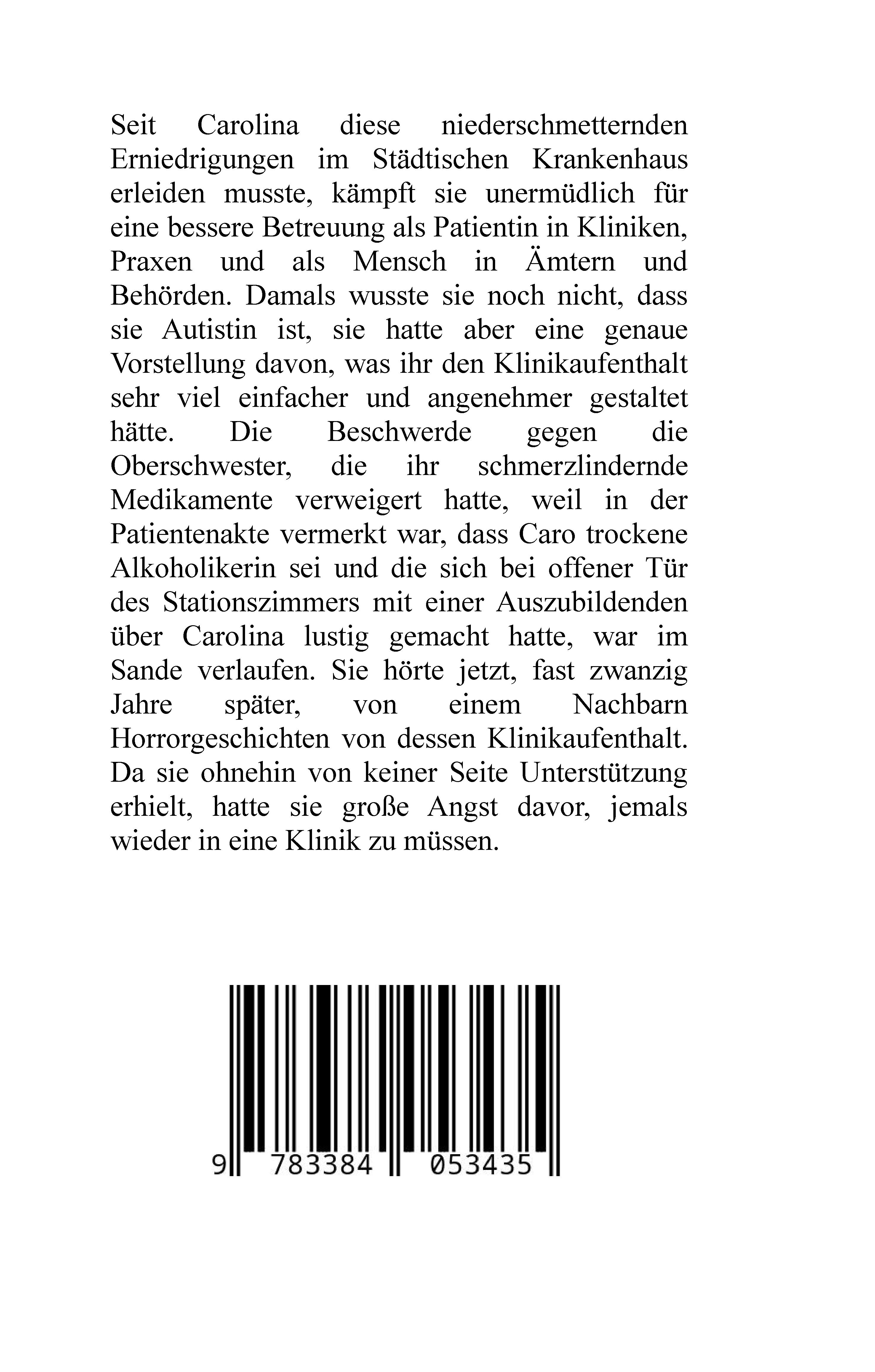 Wenn Autist*innen einmal ins Krankenhaus müssen, dann bekommen sie große Probleme allein schon bei der Unterbringung. Zu viele Menschen, zu laut, zu grell, zu vermieft, kurz: überhaupt nicht autistengerecht. Wie müsste ein solches Zimmer aussehen? Darauf versucht dieses Buch Antworten zu geben. Es beschreibt den Alltag einer Autistin und die vielen Bereiche, die nur auf neurotypische Menschen ausgerichtet sind und Autist*innen vernachlässigen.