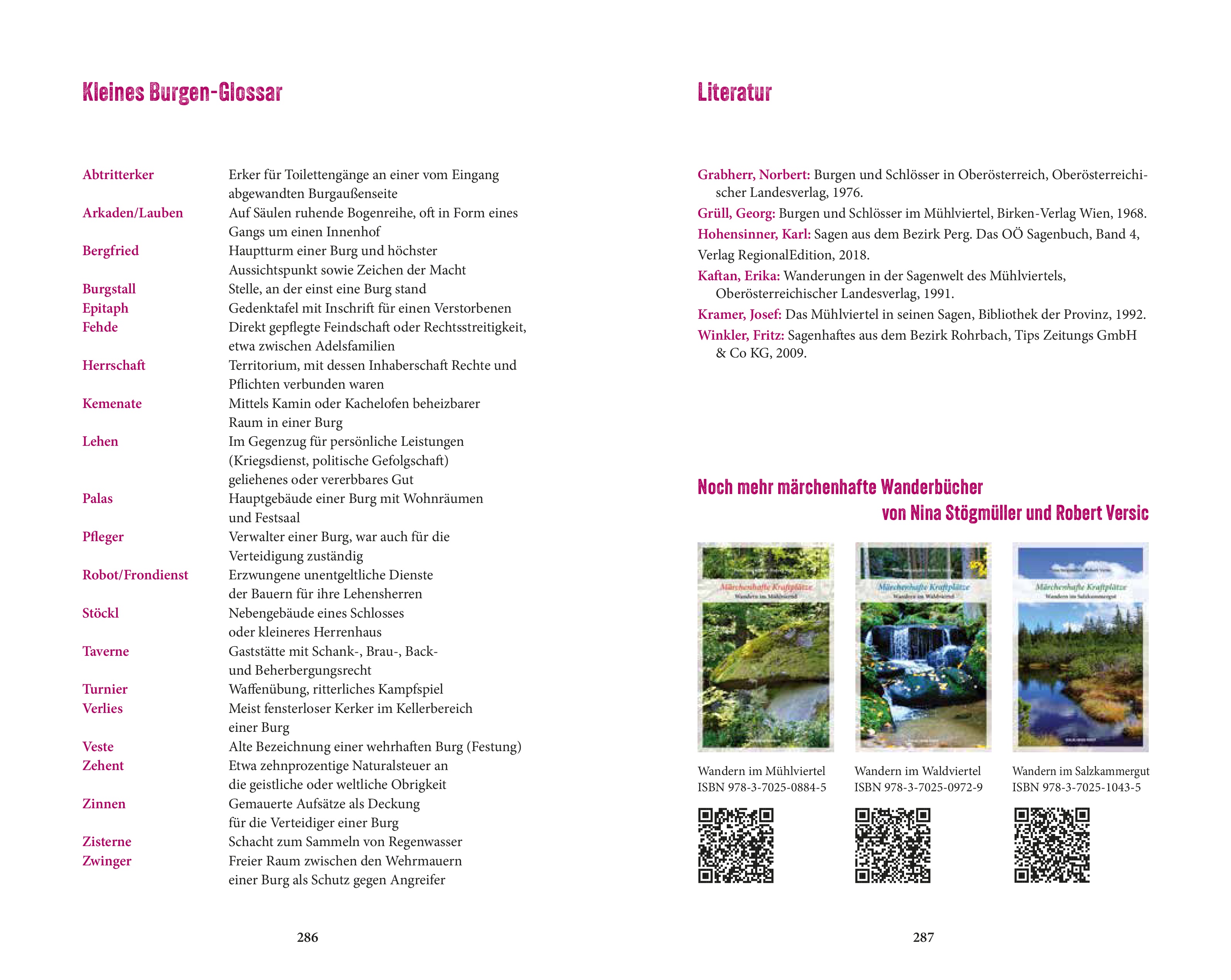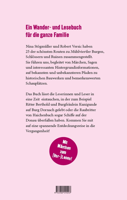 Zwei Jahre lang waren Märchenfee Nina Stögmüller und Wanderprofi Robert Versic im Mühlviertel unterwegs, um die schönsten Routen zu Schlössern, Burgen und Ruinen dieser Region zusammenzustellen. Insgesamt 25 Wanderungen führen, jeweils begleitet von Märchen, Sagen und interessanten Hintergrundinformationen, auf bekannten und unbekannten Pfaden zu historischen Bauwerken und Schauplätzen.