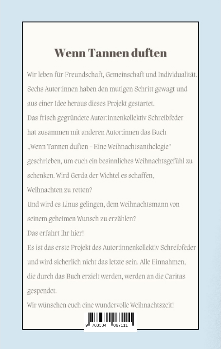"Wenn Tannen duften" ist eine Anthologie voller weihnachtlicher Momente für Jung und Alt. Zwischen Engeln, Weihnachtswichteln, sprechenden Pinguinen und Sternen kommen immer wieder die überaus menschlichen Momente der Vorweihnachtszeit hervor.