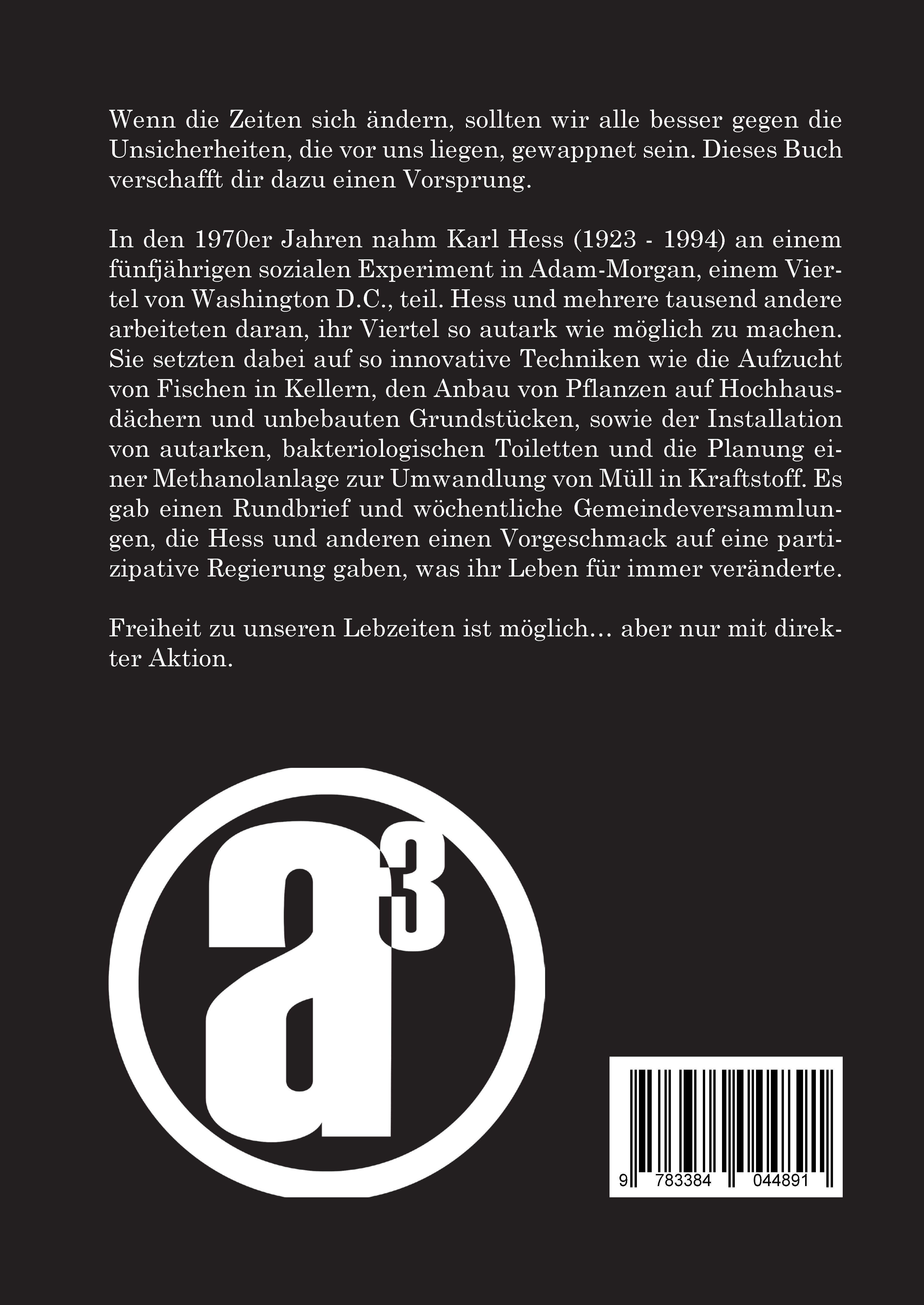 Wenn die Zeiten sich ändern, sollten wir alle besser gegen die Unsicherheiten, die vor uns liegen, gewappnet sein. Dieses Buch verschafft dir dazu einen Vorsprung.In den 1970er Jahren nahm Karl Hess (1923 - 1994) an einem fünfjährigen sozialen Experiment in Adam-Morgan, einem Viertel von Washington D.C., teil. Hess und mehrere tausend andere arbeiteten daran, ihr Viertel so autark wie möglich zu machen. Sie setzten dabei auf so innovative Techniken wie die Aufzucht von Fischen in Kellern, den Anbau von Pflanzen auf Hochhausdächern und unbebauten Grundstücken, sowie der Installation von autarken, bakteriologischen Toiletten und die Planung einer Methanolanlage zur Umwandlung von Müll in Kraftstoff. Es gab einen Rundbrief und wöchentliche Gemeindeversammlungen, die Hess und anderen einen Vorgeschmack auf eine partizipative Regierung gaben, was ihr Leben für immer veränderte.Freiheit zu unseren Lebzeiten ist möglich... aber nur mit direkter Aktion.