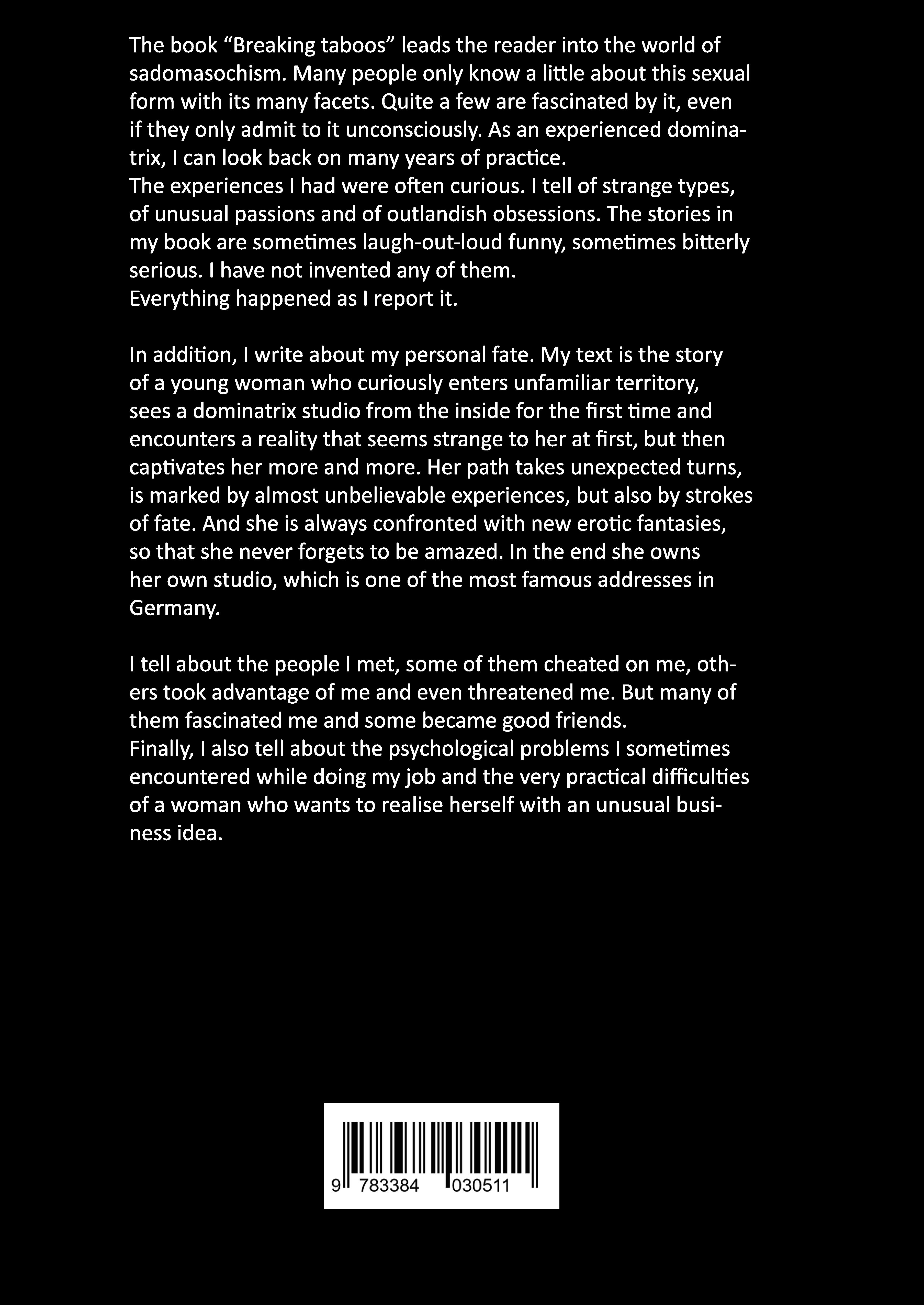 The book " Breaking Taboos" takes the reader into the world of sadomasochism. Many people only know about this sexual variety with its many facets. Quite a few are fascinated by it, even if they only admit it unconsciously. As an experienced dominatrix, I can look back on many years of practice. The experiences I had in the process were often curious. I tell of strange types, of unusual passions and of outlandish obsessions. The stories my book collects are sometimes laugh-out-loud funny, sometimes full of bitter seriousness. I have not invented any of them. Everything happened as I report it. In addition, I write about my personal fate. My text is the story of a young woman who curiously enters unfamiliar territory, sees a dominatrix studio from the inside for the first time and encounters a reality that seems strange to her at first, but then captivates her more and more. Her path takes unexpected turns, is marked by almost unbelievable experiences, but also by strokes of fate. And she is always confronted with new erotic fantasies, so that she never forgets to be amazed. In the end, she owns her own studio, which is one of the most famous addresses in Germany. I tell about the people I met. Some have cheated me, others have taken advantage of me and even threatened me. But many of them fascinated me and some became good friends. Finally, I also tell about the psychological problems I sometimes encountered while doing my job and the very practical difficulties of a woman who wants to realise herself with an unusual business idea.Das Buch "Tabubruch" führt den Leser in die Welt des Sadomasochismus. Als erfahrene Domina kann ich auf eine langjährige Praxis zurückblicken. Die Erlebnisse, die ich dabei hatte, waren oft kurios. Ich erzähle von schrägen Typen, von ungewöhnlichen Leidenschaften und von ausgefallenen Obsessionen. Die Geschichten, die mein Buch versammelt, sind manchmal zum Lachen komisch, manchmal auch voll bitterem Ernst. Darüber hinaus schreibe ich von meinem persönlichen Schicksal. Mein Text ist die Geschichte einer jungen Frau, die sich neugierig auf fremdes Terrain begibt, zum ersten Mal ein Domina Studio von innen sieht und dort einer Wirklichkeit begegnet, die ihr anfangs fremd erscheint, sie dann aber immer mehr in den Bann zieht. Ihr Weg nimmt ungeahnte Wendungen, ist gezeichnet von fast unglaublichen Erfahrungen, aber auch von Schicksalsschlägen. Und stets wird sie mit neuen erotischen Phantasien konfrontiert, so dass sie das Staunen niemals verlernt. Am Ende besitzt sie ihr eigenes Studio, das zu den bekanntesten Adressen in Deutschland gehört. Ich erzähle von den Menschen, die mir begegneten. Manche haben mich betrogen, andere haben mich ausgenutzt und mich sogar bedroht. Aber viele von ihnen haben mich fasziniert und einige sind gute Freunde geworden. Ich erzähle schließlich auch von den psychischen Problemen, denen ich mitunter bei der Ausübung meines Berufes begegnete und den ganz praktischen Schwierigkeiten einer Frau, die sich mit einer ungewöhnlichen Geschäftsidee verwirklichen will.