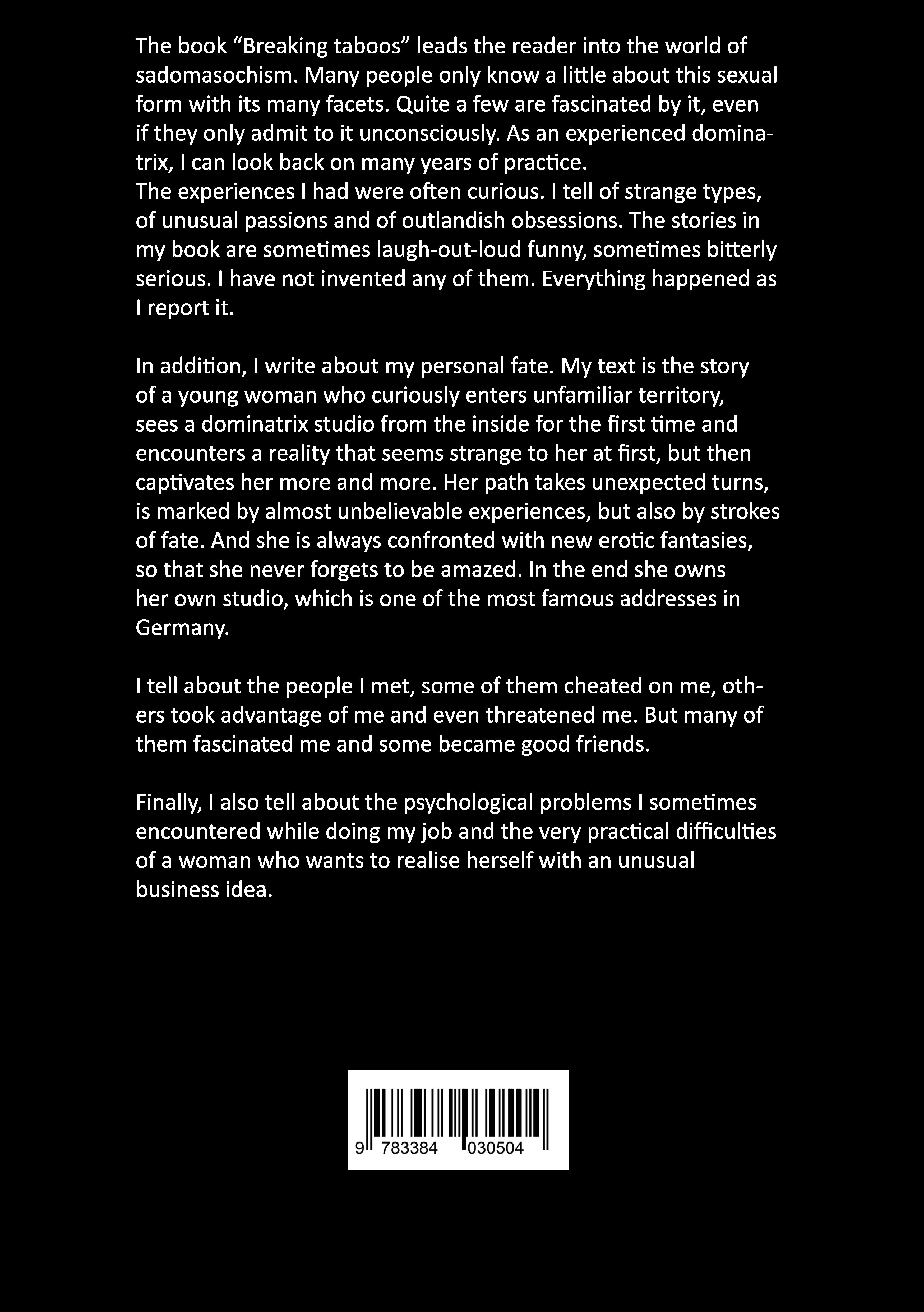 The book " Breaking Taboos" takes the reader into the world of sadomasochism. Many people only know about this sexual variety with its many facets. Quite a few are fascinated by it, even if they only admit it unconsciously. As an experienced dominatrix, I can look back on many years of practice. The experiences I had in the process were often curious. I tell of strange types, of unusual passions and of outlandish obsessions. The stories my book collects are sometimes laugh-out-loud funny, sometimes full of bitter seriousness. I have not invented any of them. Everything happened as I report it. In addition, I write about my personal fate. My text is the story of a young woman who curiously enters unfamiliar territory, sees a dominatrix studio from the inside for the first time and encounters a reality that seems strange to her at first, but then captivates her more and more. Her path takes unexpected turns, is marked by almost unbelievable experiences, but also by strokes of fate. And she is always confronted with new erotic fantasies, so that she never forgets to be amazed. In the end, she owns her own studio, which is one of the most famous addresses in Germany. I tell about the people I met. Some have cheated me, others have taken advantage of me and even threatened me. But many of them fascinated me and some became good friends. Finally, I also tell about the psychological problems I sometimes encountered while doing my job and the very practical difficulties of a woman who wants to realise herself with an unusual business idea.Das Buch "Tabubruch" führt den Leser in die Welt des Sadomasochismus. Als erfahrene Domina kann ich auf eine langjährige Praxis zurückblicken. Die Erlebnisse, die ich dabei hatte, waren oft kurios. Ich erzähle von schrägen Typen, von ungewöhnlichen Leidenschaften und von ausgefallenen Obsessionen. Die Geschichten, die mein Buch versammelt, sind manchmal zum Lachen komisch, manchmal auch voll bitterem Ernst. Darüber hinaus schreibe ich von meinem persönlichen Schicksal. Mein Text ist die Geschichte einer jungen Frau, die sich neugierig auf fremdes Terrain begibt, zum ersten Mal ein Domina Studio von innen sieht und dort einer Wirklichkeit begegnet, die ihr anfangs fremd erscheint, sie dann aber immer mehr in den Bann zieht. Ihr Weg nimmt ungeahnte Wendungen, ist gezeichnet von fast unglaublichen Erfahrungen, aber auch von Schicksalsschlägen. Und stets wird sie mit neuen erotischen Phantasien konfrontiert, so dass sie das Staunen niemals verlernt. Am Ende besitzt sie ihr eigenes Studio, das zu den bekanntesten Adressen in Deutschland gehört. Ich erzähle von den Menschen, die mir begegneten. Manche haben mich betrogen, andere haben mich ausgenutzt und mich sogar bedroht. Aber viele von ihnen haben mich fasziniert und einige sind gute Freunde geworden. Ich erzähle schließlich auch von den psychischen Problemen, denen ich mitunter bei der Ausübung meines Berufes begegnete und den ganz praktischen Schwierigkeiten einer Frau, die sich mit einer ungewöhnlichen Geschäftsidee verwirklichen will.