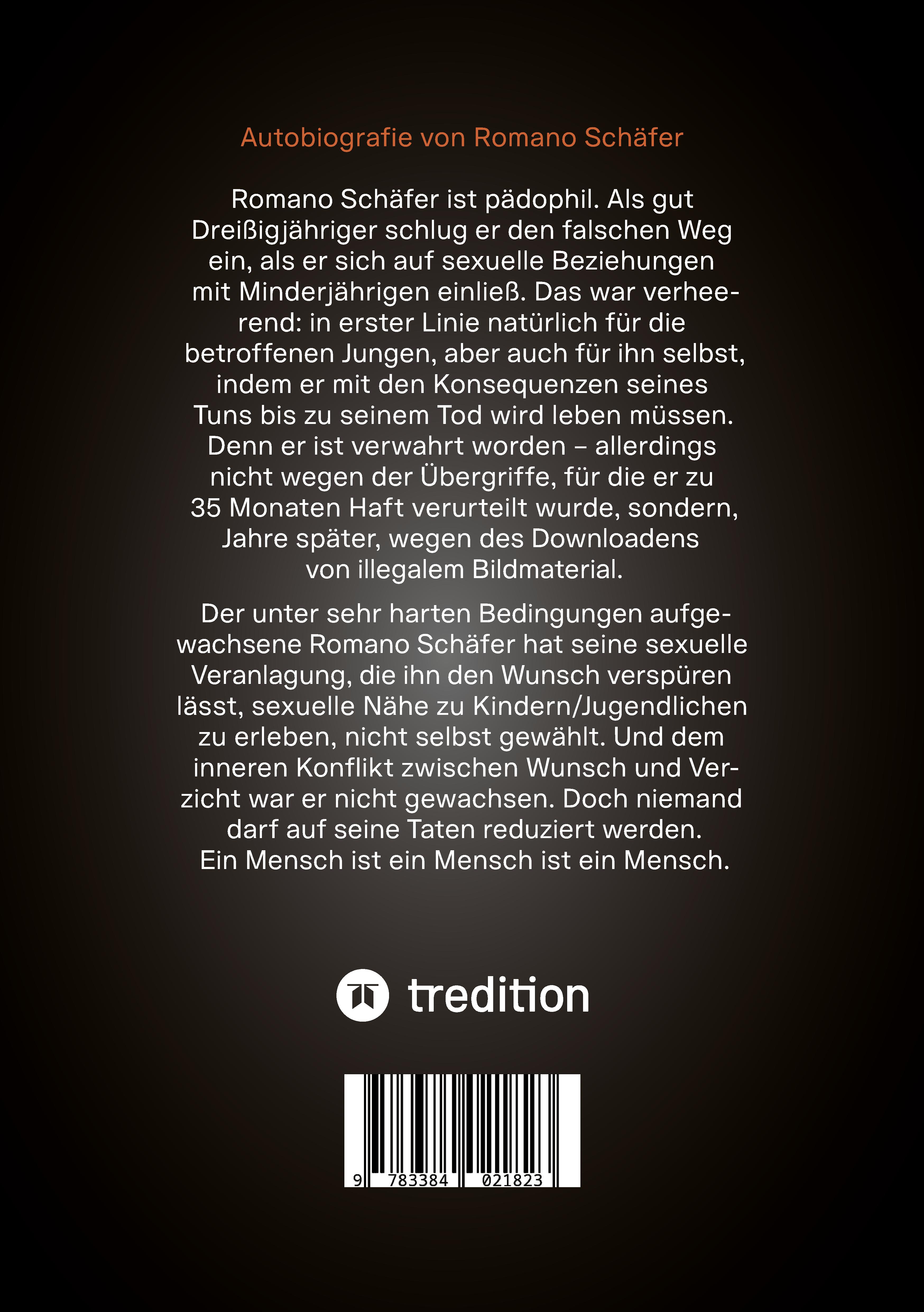 Romano Schäfer, geboren im November 1960; gelernter Koch, aber in ganz verschiedenen Berufen tätig gewesen (Koch, Betriebsarbeiter, Nachtportier, Chauffeur B, Bootsführer u. a.); 2006 Verurteilung zu 35 Monaten Haft für drei pädosexuelle Vergehen; 2008 Aufschiebung der Haft zugunsten einer Maßnahme nach Art. 59 StGB; 2017 Entlassung aus der Haft; 2018 erneute Verhaftung wegen des Konsums von illegalen Bildern; 2020 Verwahrung nach Art. 64 StGB. Zurzeit hofft er auf ein positives Urteil des Europäischen Gerichtshofs für Menschenrechte EGMR in Strasbourg, wo sein Verfahren hängig ist.