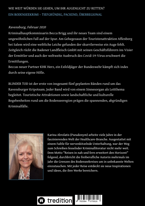 "Blinder Tod" ist der erste von insgesamt fünf geplanten Bänden rund um das Ravensburger Kripoteam. Jeder Band wird von einem anderem Sinnesorgan als Leitthema begleitet. Touristische Attraktionen sowie landschaftliche und kulturelle Begebenheiten rund um die Bodenseeregion prägen die spannenden, abgründigen Kriminalfälle. Ebenfalls abgebildet ist das historische Zeitgeschehen um die Corona-Pandemie beginnend im Frühjahr 2020, insbesondere aus dem Blickwinkel der verschiedenen Polizeiprotagonisten.Ein vielschichtiger Kriminalroman mit einer gehörigen Portion Lokalkolorit aber auch multikulturellen Aspekten. Mehrere Handlungsstränge ziehen sich durch das Buch und finden teils in den weiteren Bänden ihre Fortsetzung.Wie weit würden Sie gehen, um Ihr Augenlicht zu retten?Ein Bodenseekrimi - tiefgründig, packend, überregionalRavensburg, Februar 2020Die ehrgeizige Kommissarin Becca Brigg ist mit ihrem neuen Team unter den Eindrücken der sich weltweit ausbreitenden Covid-19-Pandemie einem ungewöhnlichen Fall auf der Spur.Am Gehegezaun der Touristenattraktion Affenberg bei Salem wird eine weibliche Leiche gefunden der skurrilerweise ein Auge fehlt. Zeitgleich rückt die Badener Landfleisch GmbH mit seinen Geschäftsführern ins Visier der Ermittler.Beccas neuer Partner im Präsidum Ravensburg, KHK Herz, ein Exfeldjäger der Bundeswehr kämpft sich indes durch seine eigene Hölle.