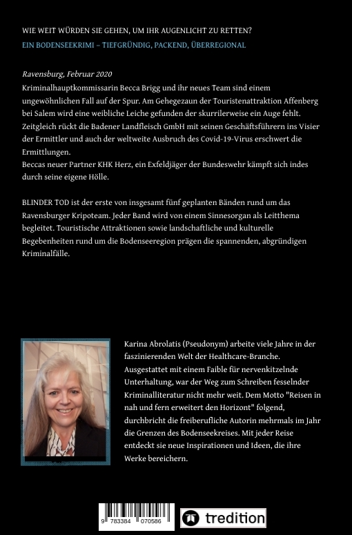 "Blinder Tod" ist der erste von insgesamt fünf geplanten Bänden rund um das Ravensburger Kripoteam. Jeder Band wird von einem anderem Sinnesorgan als Leitthema begleitet. Touristische Attraktionen sowie landschaftliche und kulturelle Begebenheiten rund um die Bodenseeregion prägen die spannenden, abgründigen Kriminalfälle. Ebenfalls abgebildet ist das historische Zeitgeschehen um die Corona-Pandemie beginnend im Frühjahr 2020, insbesondere aus dem Blickwinkel der verschiedenen Polizeiprotagonisten.Ein vielschichtiger Kriminalroman mit einer gehörigen Portion Lokalkolorit aber auch multikulturellen Aspekten. Mehrere Handlungsstränge ziehen sich durch das Buch und finden teils in den weiteren Bänden ihre Fortsetzung.Wie weit würden Sie gehen, um Ihr Augenlicht zu retten?Ein Bodenseekrimi - tiefgründig, packend, überregionalRavensburg, Februar 2020Die ehrgeizige Kommissarin Becca Brigg ist mit ihrem neuen Team unter den Eindrücken der sich weltweit ausbreitenden Covid-19-Pandemie einem ungewöhnlichen Fall auf der Spur.Am Gehegezaun der Touristenattraktion Affenberg bei Salem wird eine weibliche Leiche gefunden der skurrilerweise ein Auge fehlt. Zeitgleich rückt die Badener Landfleisch GmbH mit seinen Geschäftsführern ins Visier der Ermittler.Beccas neuer Partner im Präsidum Ravensburg, KHK Herz, ein Exfeldjäger der Bundeswehr kämpft sich indes durch seine eigene Hölle.