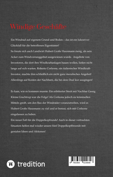 Ein Windrad auf eigenen Grund und Boden - das ist ein lukrativer Glückfall für die betroffenen Eigentümer!So freute sich auch Landwirt Hubert Große Hausmann riesig, als sein Acker zum Windvorranggebiet ausgewiesen wurde. Angebote von Investoren, die dort ihre Windkraftanlagen bauen wollen, ließen nicht lange auf sich warten. Roberto Corleone, ein italienischer Windkraft-Investor, machte ihm schließlich ein nicht ganz moralisches Angebot! Allerdings auf Kosten der Nachbarn, die bei dem Deal leer ausgingen! #Es kam, wie es kommen musste: Ein erbitterter Streit mit Nachbar Georg Kleine Grachtrup war die Folge! Als Corleone jedoch zu kriminellen Mitteln greift, um den Bau der Windräder voranzutreiben, wird es Hubert Große Hausmann zu viel und er bereut, sich mit Corleone eingelassen zu haben.In dieser vertrackten Situation helfen mal wieder unsere fünf Doppelkopffreunde mit genialen Ideen und Aktionen. Ob es schließlich gelingt, Corleone loszuwerden, wird in diesem Buch in ebenso spannender wie unterhaltsamer Weise dargestellt.