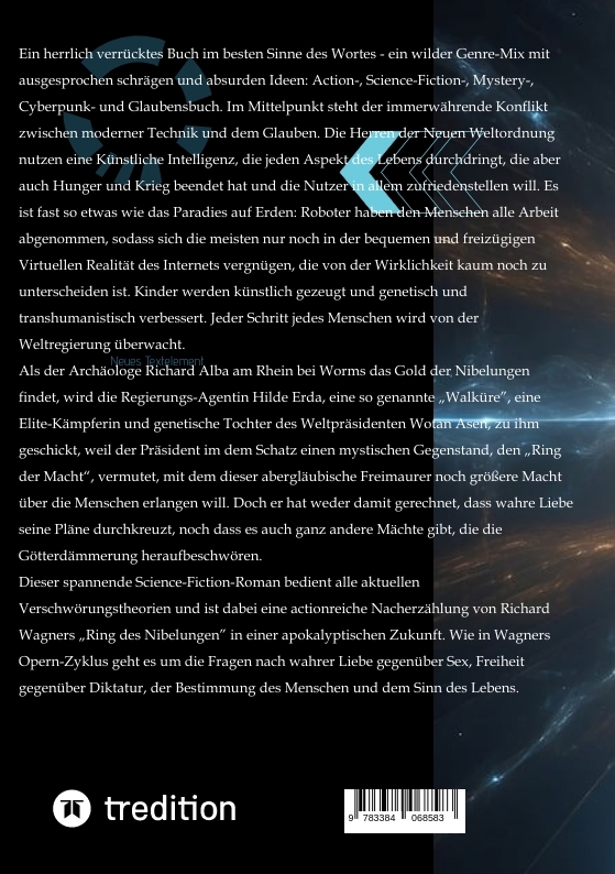 Ein herrlich verrücktes Buch im besten Sinne des Wortes - ein wilder Genre-Mix mit ausgesprochen schrägen und absurden Ideen: Action-, Science-Fiction-, Mystery-, Cyberpunk- und Glaubensbuch. Im Mittelpunkt steht der immerwährende Konflikt zwischen moderner Technik und dem Glauben. Die Herren der Neuen Weltordnung nutzen eine Künstliche Intelligenz, die jeden Aspekt des Lebens durchdringt, die aber auch Hunger und Krieg beendet hat und die Nutzer in allem zufriedenstellen will. Es ist fast so etwas wie das Paradies auf Erden: Roboter haben den Menschen alle Arbeit abgenommen, sodass sich die meisten nur noch in der bequemen und freizügigen Virtuellen Realität des Internets vergnügen, die von der Wirklichkeit kaum noch zu unterscheiden ist. Kinder werden künstlich gezeugt und genetisch und transhumanistisch verbessert. Jeder Schritt jedes Menschen wird von der Weltregierung überwacht, doch die letzten Christen werden verfolgt.Als der Archäologe Richard Alba am Rhein bei Worms das Gold der Nibelungen findet, wird die Regierungs-Agentin Hilde Erda, eine so genannte "Walküre", eine Elite-Kämpferin und genetische Tochter des Weltpräsidenten Wotan Asen, zu ihm geschickt, weil der Präsident im dem Schatz einen mystischen Gegenstand, den "Ring der Macht", vermutet, mit dem dieser abergläubische Freimaurer noch größere Macht über die Menschen erlangen will. Doch er hat weder damit gerechnet, dass wahre Liebe seine Pläne durchkreuzt, noch dass es auch ganz andere Mächte gibt, die die Götterdämmerung heraufbeschwören.Dieser spannende Science-Fiction-Roman bedient alle aktuellen Verschwörungstheorien und ist dabei eine actionreiche Nacherzählung von Richard Wagners "Ring des Nibelungen" in einer apokalyptischen Zukunft. Wie in Wagners Opern-Zyklus geht es um die Fragen nach wahrer Liebe gegenüber Sex, Freiheit gegenüber Diktatur, der Bestimmung des Menschen und dem Sinn des Lebens.