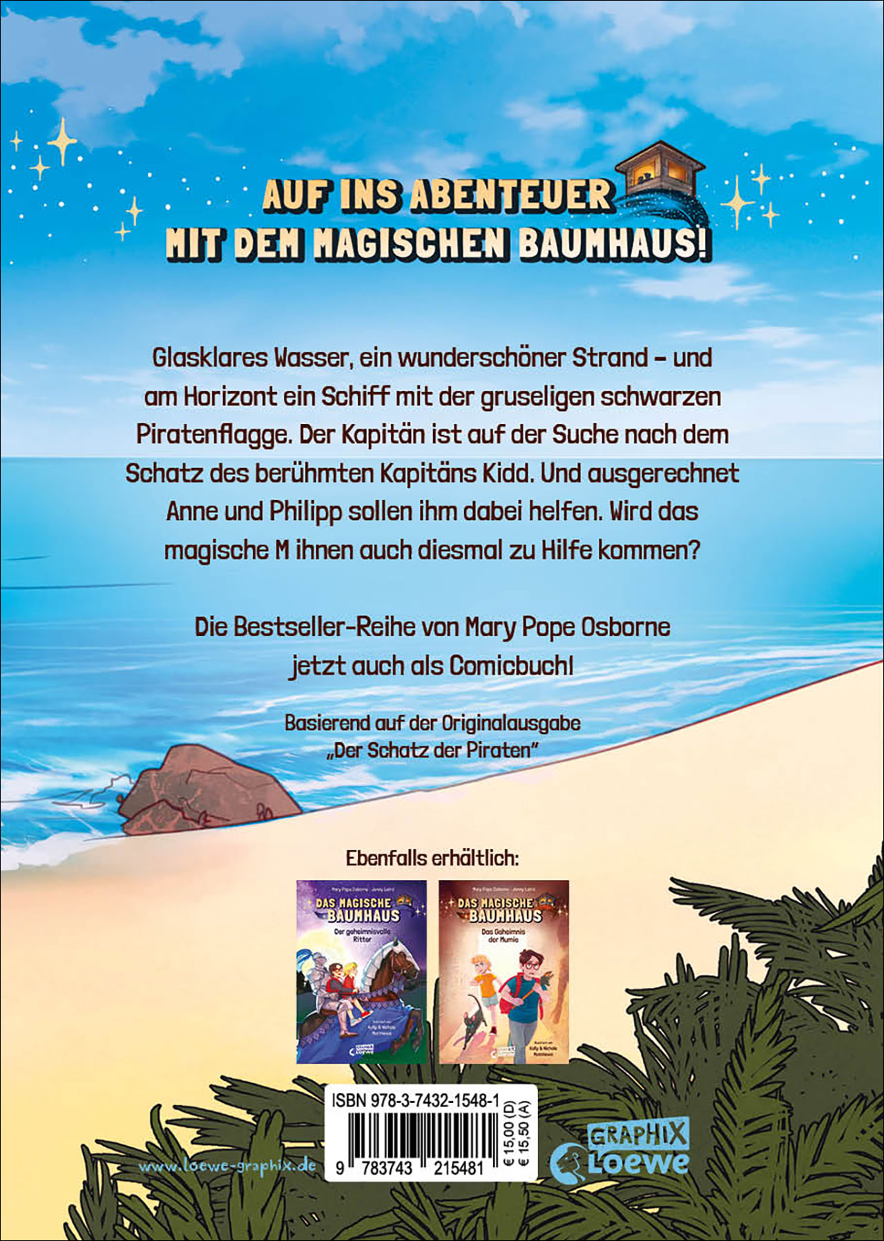 Das magische Baumhaus fliegt zu den Piraten Glasklares Wasser, ein wunderschöner Strand - Anne und Philipp haben nicht viel Zeit, ihre Reise in die Karibik zu genießen. Schon taucht am Horizont ein Schiff mit der gruseligen schwarzen Piratenflagge auf. Der Kapitän lässt Anne und Philipp bei Wasser und Schiffszwieback in den Laderaum seines Schiffes werfen, bis sie ihm helfen, den Schatz des berühmten Kapitäns Kidd zu finden. Wird das magische M Anne und Philipp auch diesmal zu Hilfe kommen? Das Magische Baumhaus feiert auch als Comicbuch Erfolge. Ideal für alle, die das Abenteuer Lesen erst entdecken.
