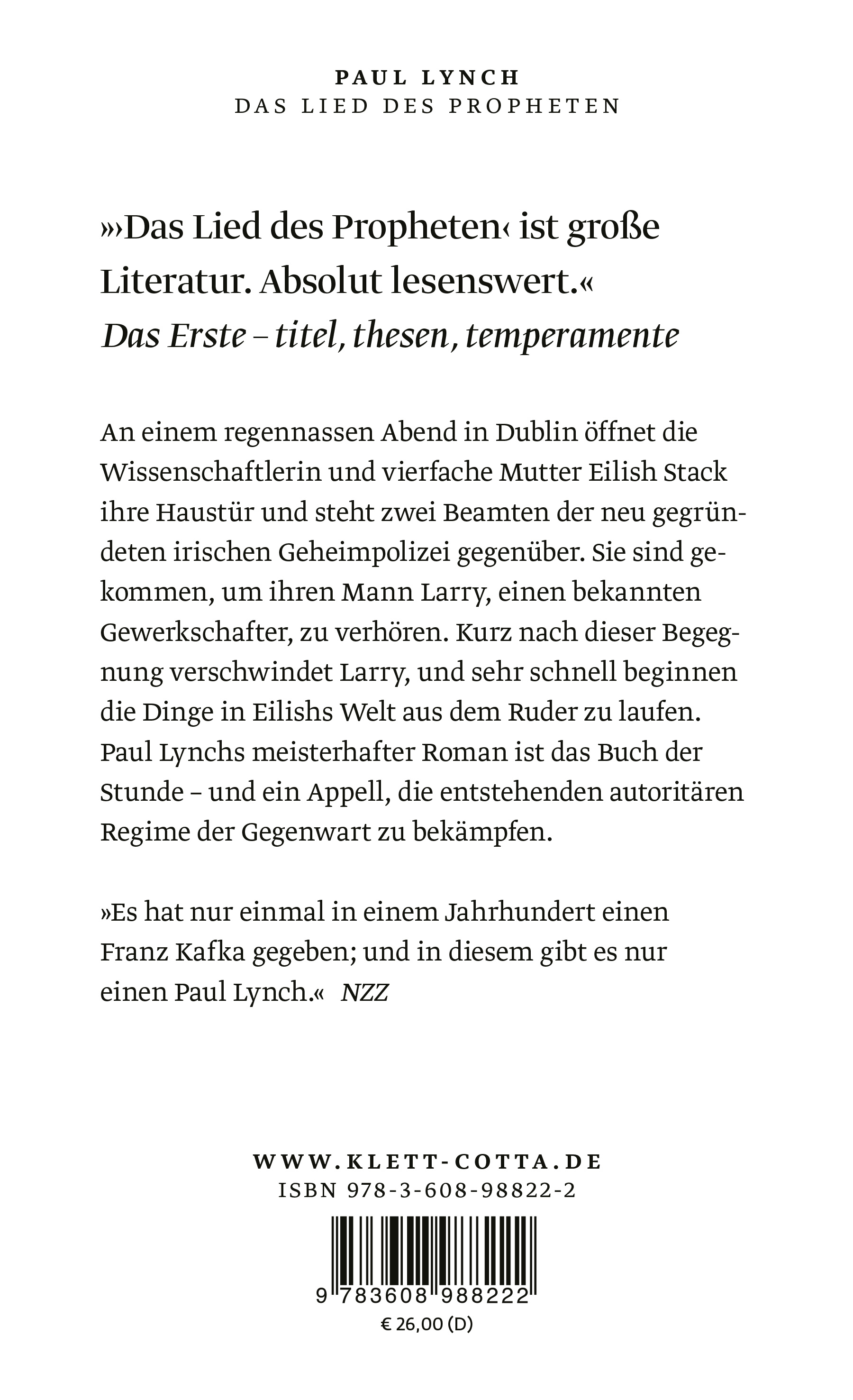 »Paul Lynch kreiert eine klaustrophobische, atemlose Stimmung, herzzerreißende Szenen, Fiktion, die die Wirklichkeit greifbar, die tiefere Wahrheit sichtbar macht. […] ›Das Lied des Propheten‹ ist große Literatur. Absolut lesenswert.« – Claudia Kuhland, Das Erste titel, thesen, temperamente, 28. Juli 2024