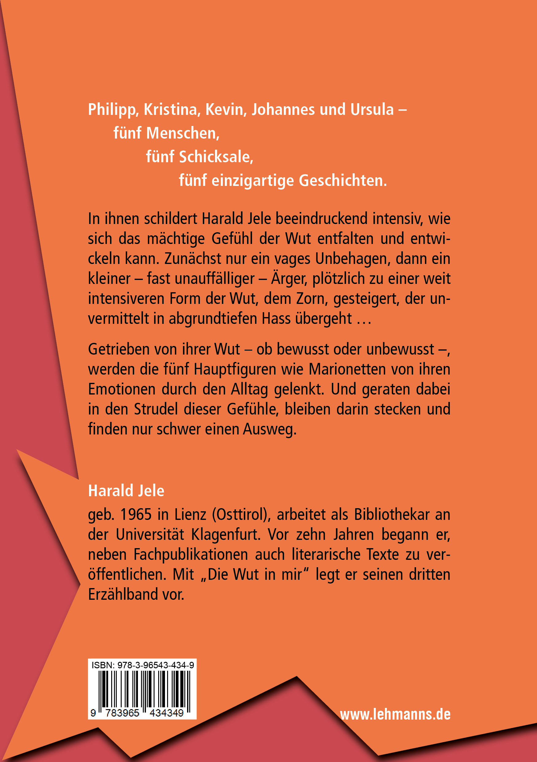 Philipp, Kristina, Kevin, Johannes und Ursula - fünf Menschen, fünf Schicksale, fünf einzigartige Geschichten. | In ihnen schildert Harald Jele beeindruckend intensiv, wie sich das mächtige Gefühl der Wut entfalten und entwickeln kann. Zunächst nur ein vages Unbehagen, dann ein kleiner - fast unauffälliger - Ärger, plötzlich zu einer weit intensiveren Form der Wut, dem Zorn, gesteigert, der unvermittelt in abgrundtiefen Hass übergeht ... | Getrieben von ihrer Wut - ob bewusst oder unbewusst -, werden die fünf Hauptfiguren wie Marionetten von ihren Emotionen durch den Alltag gelenkt. Und geraten dabei in den Strudel dieser Gefühle, bleiben darin stecken und finden nur schwer einen Ausweg.