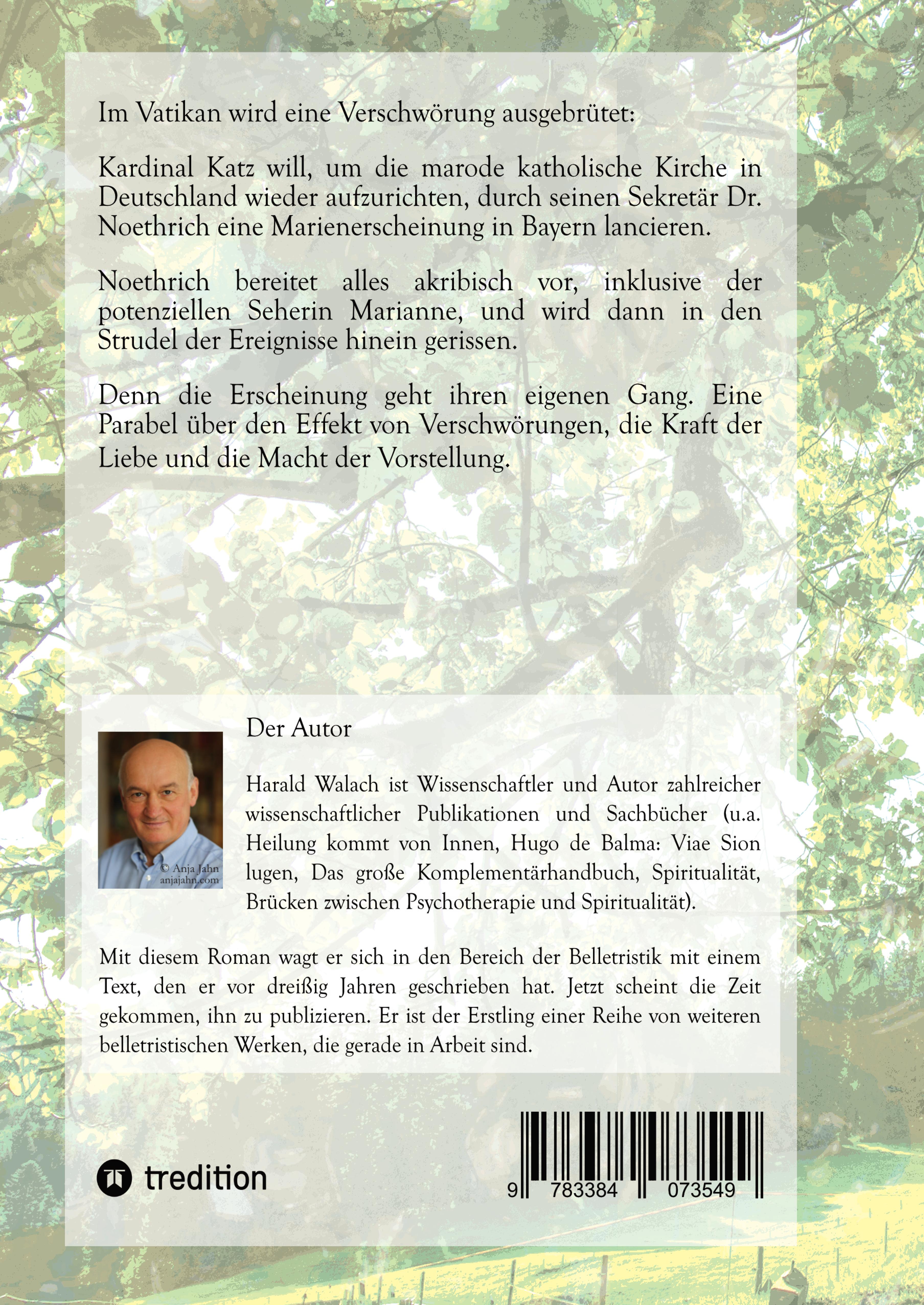 Harald Walach ist im ersten Leben und im ersten Beruf Psychologe, Wissenschaftstheoretiker und Wissenschaftler. Er ist es immer noch. Aber mit zunehmendem Alter hat es ihn gereizt, das Schreiben auch in andere, fantastischere Bereiche auszudehnen, genauer gesagt Erfahrungen und Erkenntnisse, die man im Raum der Wissenschaft nicht so einfach und ungeschützt verbreiten kann, anders zu publizieren. Daher hat er vor vielen Jahren, genauer gesagt im Jahre 1994, als ihn der Hafer gestochen hat, einen Roman geschrieben. Ausgangspunkt war der Erfahrungsbericht seiner Mutter über eine Reise an den von der Kirche nicht anerkannten Marienwallfahrtsort Medjugorje. Daraus entstand die Idee einmal durchzubuchstabieren, was passieren würde, wenn.... sich im Vatikan einer überlegen würde, eine solche Erscheinung zu lancieren. Und wie das mit Geschichten so ist, sie haben ihr Eigenleben, und daraus entstand damals sein erster Roman "Die Erscheinung". Der verschwand in einer Kiste, die jetzt beim Umzug wieder auftauchte. Und weil er sowieso gerade an einem anderen Roman arbeitet, entschloss er sich, diesen ersten Roman zu publizieren. In seinen wissenschaftlichen Texten beschäftigen Harald Walach Fragen der Heilung und des Bewusstseins. In seinen belletristischen Texten geht es vor allem darum, wie und wohin sich unsere Kultur entwickelt und entwickeln könnte, was krumm läuft, und wie es vielleicht menschlicher und für alle angenehmer sein könnte. Hier schwadroniert er über Gott und die Welt, über die Menschen und die Liebe, und darüber, wie wir unserer Erfüllung und unserem inneren Wesen vielleicht ein bisschen näher kommen. Immer mit einem leichten Augenzwinkern. Denn es soll ja auch Spass machen und wer das Leben allzu ernst nimmt, verpasst das Beste, den Humor.