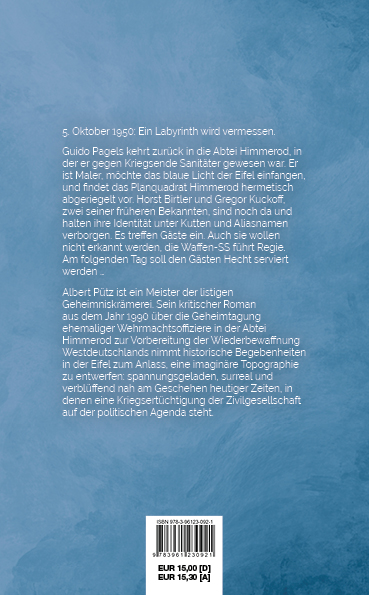 5. Oktober 1950: Ein Labyrinth wird vermessen. Guido Pagels kehrt zurück in die Abtei Himmerod, in der er gegen Kriegsende Sanitäter gewesen war. Er ist Maler, möchte das blaue Licht der Eifel einfangen, und findet das Planquadrat Himmerod hermetisch abgeriegelt vor. Horst Birtler und Gregor Kuckoff, zwei seiner früheren Bekannten, sind noch da und halten ihre Identität unter Kutten und Aliasnamen verborgen. Es treffen Gäste ein. Auch sie wollen nicht erkannt werden, die Waffen-SS führt Regie. Am folgenden Tag soll den Gästen Hecht serviert werden ...Albert Pütz ist ein Meister der listigen Geheimniskrämerei. Sein kritischer Roman aus dem Jahr 1990 über die Geheimtagung ehemaliger Wehrmachtsoffiziere in der Abtei Himmerod zur Vorbereitung der Wiederbewaffnung Westdeutschlands nimmt historische Begebenheiten in der Eifel zum Anlass, eine imaginäre Topographie zu entwerfen: spannungsgeladen, surreal und verblüffend nah am Geschehen heutiger Zeiten, in denen eine Kriegsertüchtigung der Zivilgesellschaft auf der politischen Agenda steht.