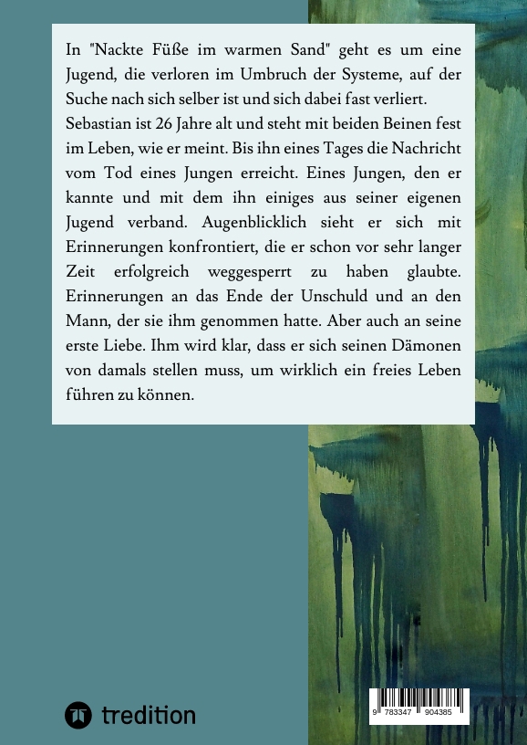 In "Nackte Füße im warmen Sand" geht es um eine Jugend, die verloren im Umbruch der Systeme, auf der Suche nach sich selber ist und sich dabei fast verliert.Sebastian ist 26 Jahre alt und steht mit beiden Beinen fest im Leben, wie er meint. Bis ihn eines Tages die Nachricht vom Tod eines Jungen erreicht. Eines Jungen, den er kannte und mit dem ihn einiges aus seiner eigenen Jugend verband. Augenblicklich sieht er sich mit Erinnerungen konfrontiert, die er schon vor sehr langer Zeit erfolgreich weggesperrt zu haben glaubte. Erinnerungen an das Ende der Unschuld und an den Mann, der sie ihm genommen hatte. Aber auch an seine erste Liebe. Ihm wird klar, dass er sich seinen Dämonen von damals stellen muss, um wirklich ein freies Leben führen zu können.