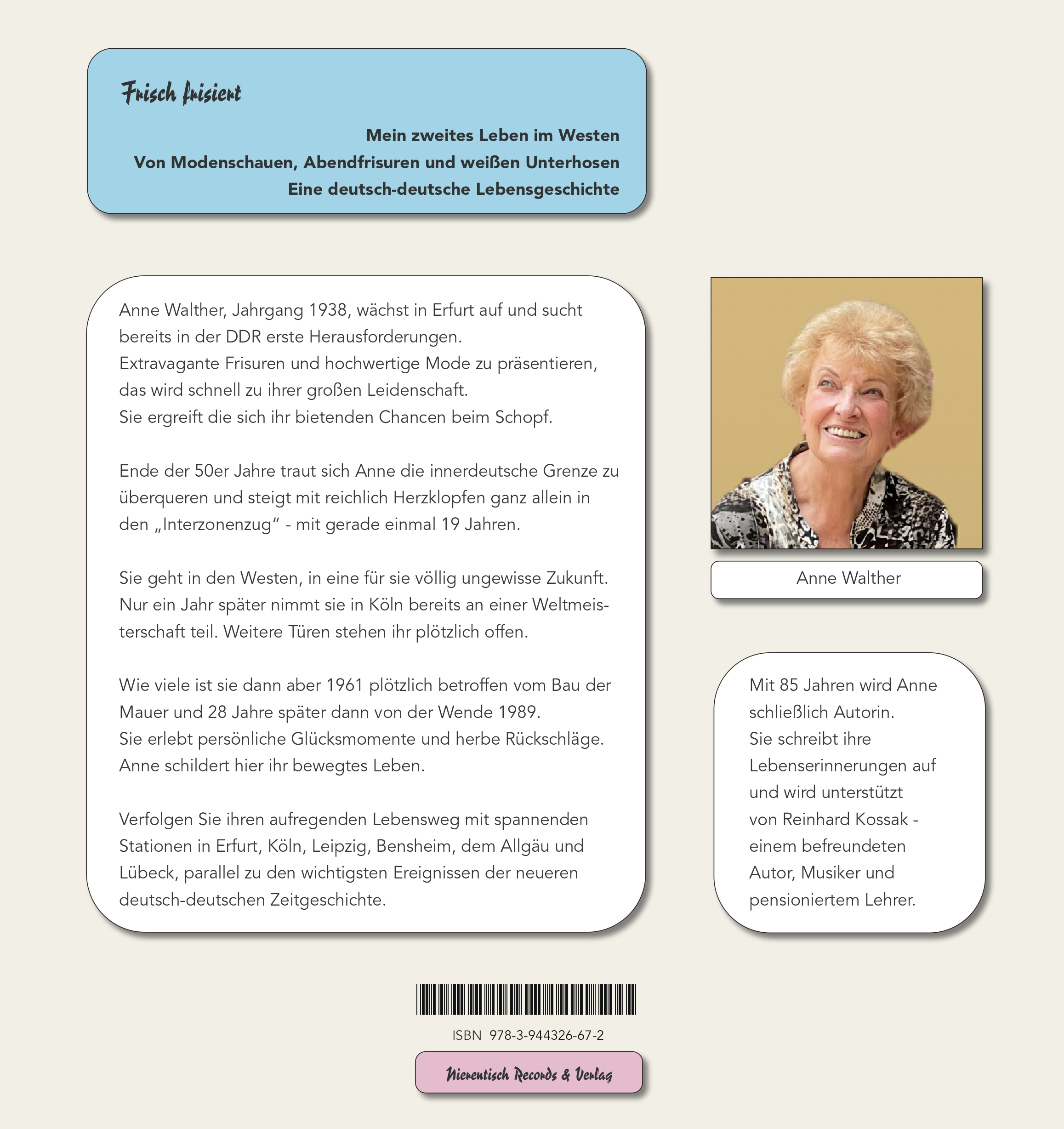 | Schlagworte | 1989 • Autobiografie • DDR • deutsch-deutsch • Erfurt • Frisuren • Interzonenzug • Köln • Lebenserinnerungen • Lübeck • Mauerbau • Modenschau • Ost-West • Wende |